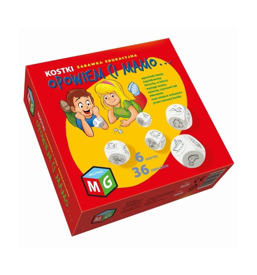 Proste rozwiązania są najlepsze - bo dają pole do działania wyobraźni. Multigra “Opowiem Ci mamo” to właśnie jedno z takich rozwiązań, dzięki którym wyobraźnia i kreatywność zostają pobudzone. To gra i zabawa edukacyjna w jednym. Składa się z 6 kostek, na których znajdują się obrazki przedstawiające 4 rzeczy: miejsce, czynność, zdarzenie i osobę. Zabawa polega na rzuceniu kostkami i ułożeniu improwizowanej historyjki, która będzie zawierała wszystkie elementy, jakie ukazały się po rzucie kostką. To świetny sposób na pobudzenie wyobraźni i kreatywności! Dzięki temu, że kombinacji po rzucie kostką jest sporo, zabawa nigdy się nie znudzi - zawsze trzeba będzie wymyślić inną historyjkę. Zabawa jest odpowiednia zarówno dla mniejszego, jak i większego grona. Im więcej osób, tym lepsza zabawa - można dodatkowo zrobić konkurs na najciekawszą, najbardziej kreatywną opowiastkę. Gra bawi i uczy: kreatywnego myślenia, poprawnego wysławiania się i zdrowej rywalizacji. Dzieci będą się bawić doskonale zarówno w swoim własnym gronie, jak i w mieszanym towarzystwie, razem z dorosłymi!