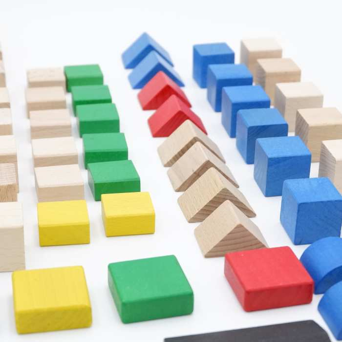 Wymiary: najmniejszy klocek 3cm x 3cm x 1,5cm, największy klocek 9cm x 3cm x 1,5cm lub 3cm x 3cm x 6cm