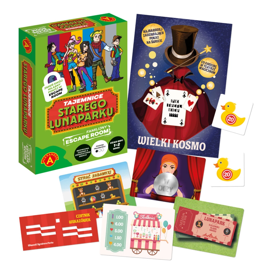 Przenieś emocje escape roomu do swojego domu dzięki grze "Escape Room: Tajemnice Starego Lunaparku" od firmy Alexander. Ta wyjątkowa gra planszowa pozwala na stworzenie interaktywnej przygody w domowym zaciszu, gdzie gracze rozwiązują serię wciągających zagadek, odkrywają tajemnicze wskazówki i korzystają z zaskakujących materiałów pomocniczych. W przeciwieństwie do tradycyjnych escape roomów, nikt nie zostaje fizycznie zamknięty, co czyni rozgrywkę bezpieczną i komfortową dla wszystkich uczestników. Elementy gry rozmieszczane są w całym pomieszczeniu, tworząc immersyjne doświadczenie, które angażuje wszystkich graczy.