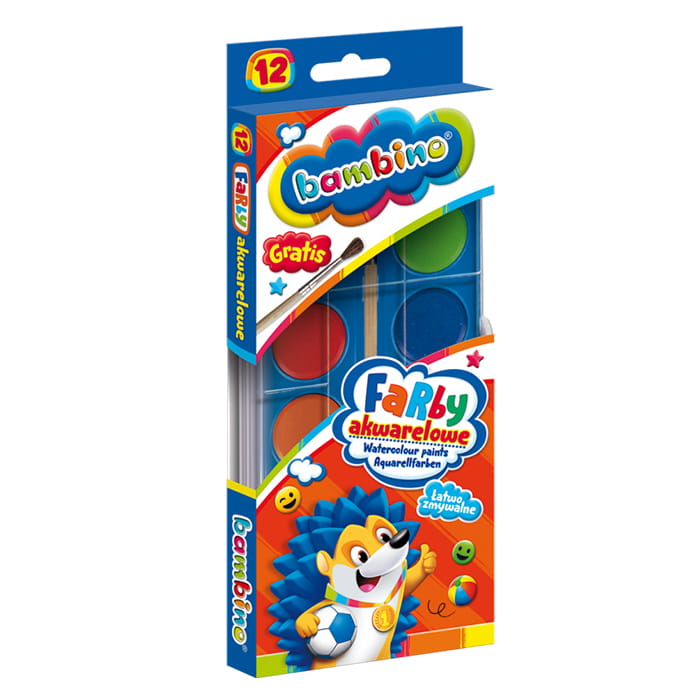 Odkryj wspaniały świat sztuki dzięki farbom akwarelowym Bambino w zestawie 12 intensywnych kolorów. To farby wodne w postaci suchych pastylek, które po zwilżeniu wodą stają się gotowe do kreatywnego użycia. Zapewniają doskonałą jakość i bezpieczeństwo użytkowania, spełniając wymogi dyrektywy Parlamentu Europejskiego i Rady w sprawie bezpieczeństwa zabawek.