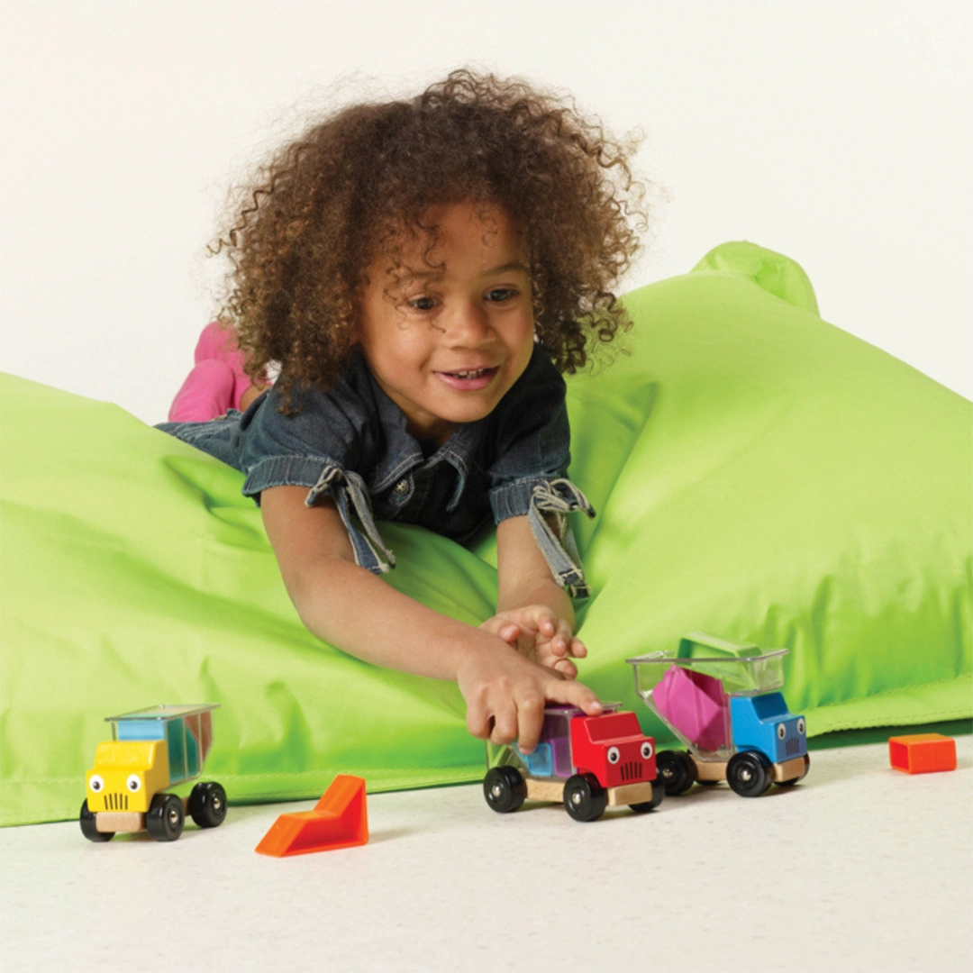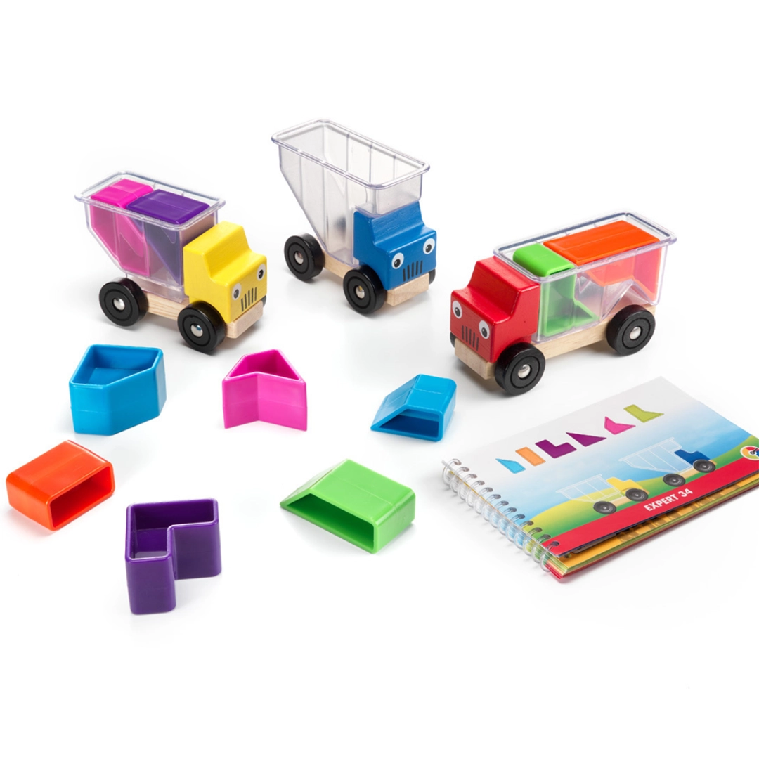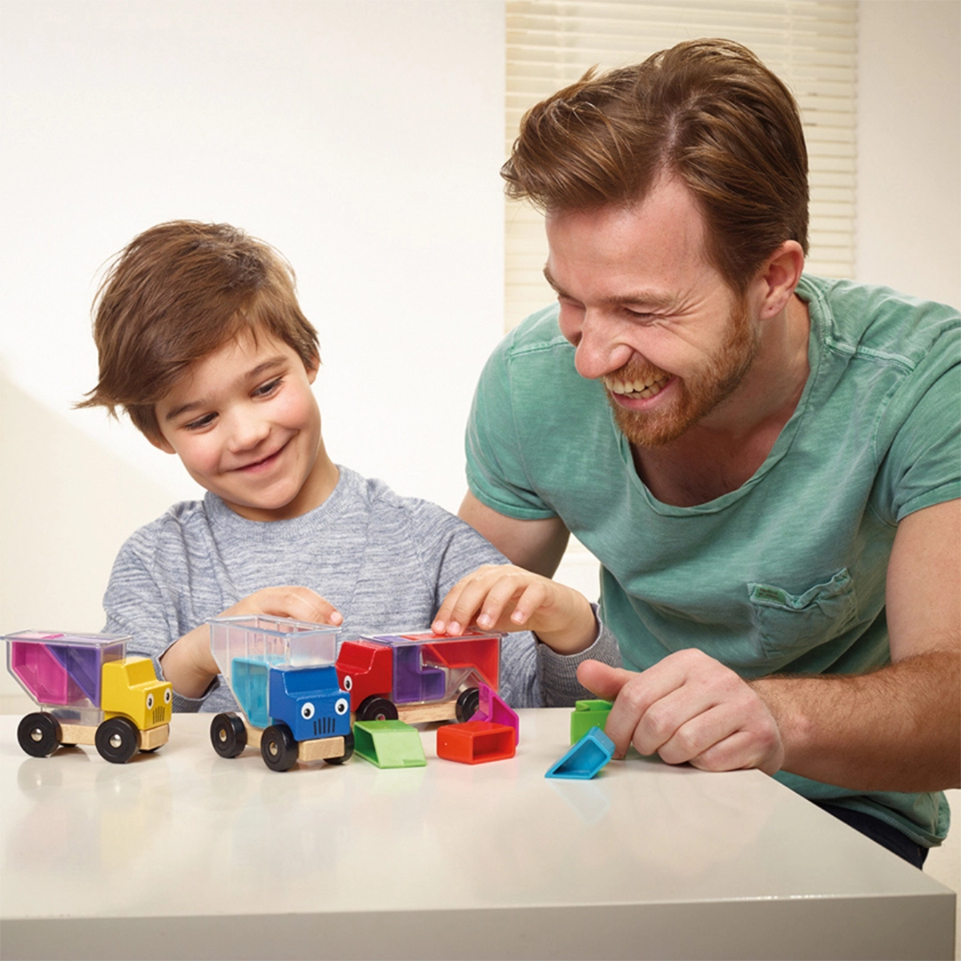 Trzy wielkie ciężarówki czekają na załadunek kolorowych klocków, aby wyruszyć w drogę. Czy pomożesz im załadować ładunek w taki sposób, aby mogły bezpiecznie dotrzeć do celu? 3 traki to gra logiczna stworzona z myślą o dziećmi od 3 lat, która rozwija umiejętności manualne i logiczne. Młodsze dzieci mogą bawić się ciężarówkami, załadowując i rozładowując klocki, traktując grę jako zabawkę. Starsze dzieci mogą korzystać z kart zadań, dopasowując klocki do poszczególnych ciężarówek zgodnie z ilustracjami.