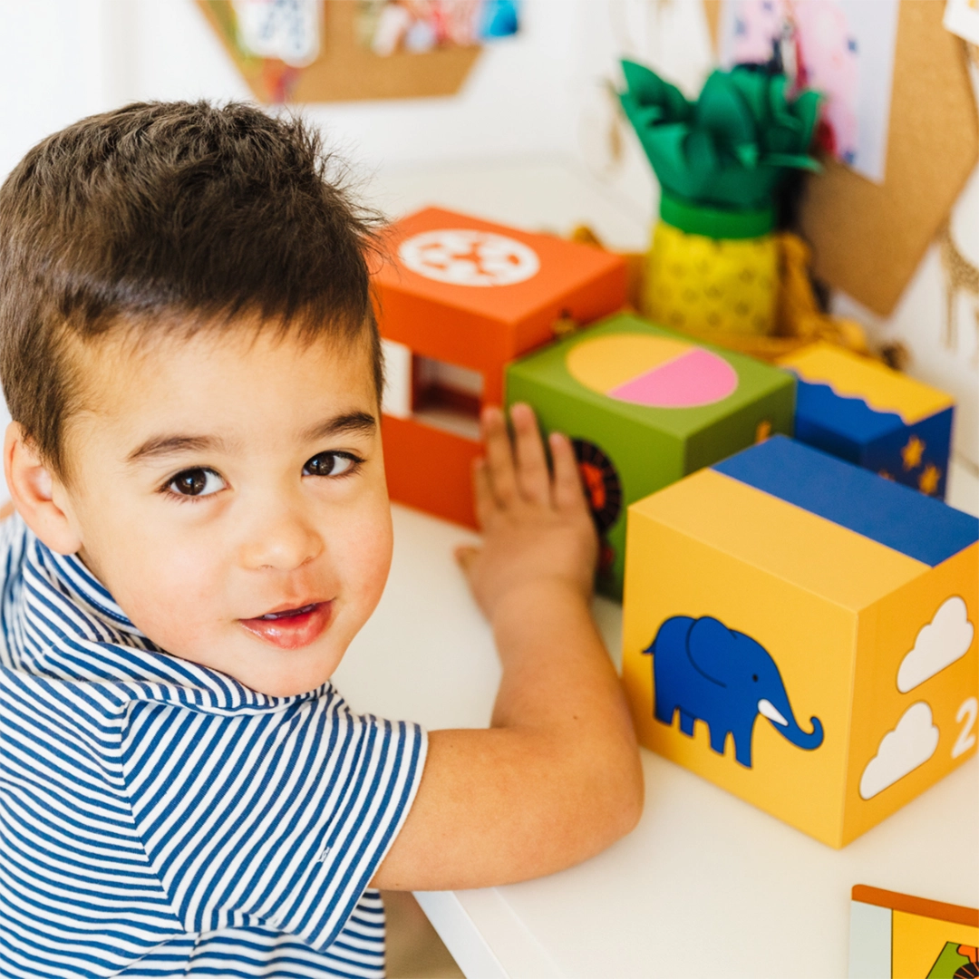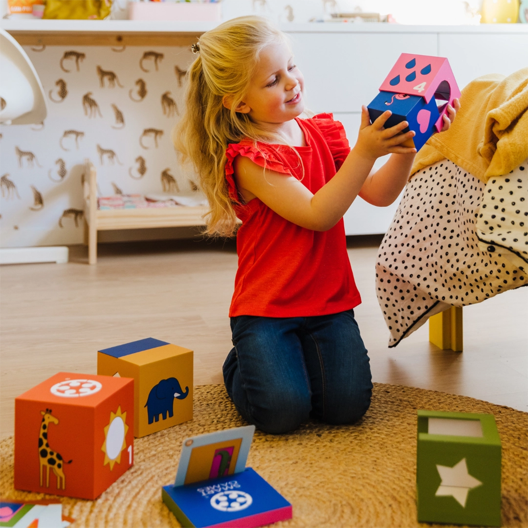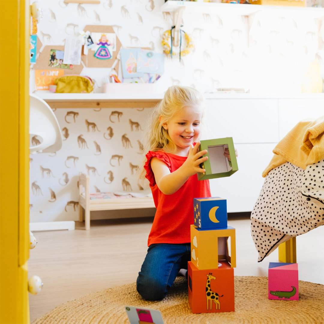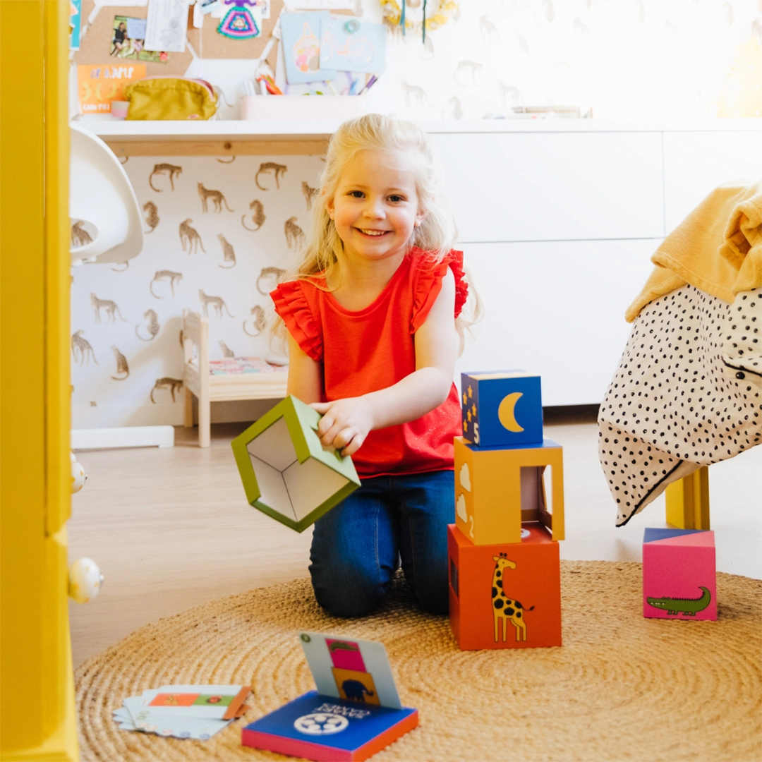 "A kuku! Zoo" to wciągająca gra logiczna dla najmłodszych, w której zwierzęta z zoo bawią się w chowanego. Zadaniem dziecka jest umieszczenie zwierząt w odpowiednich kryjówkach, odwzorowując ilustracje z kart zadań. Gra pozwala również na swobodną zabawę, gdzie maluch może tworzyć własne układy klocków, rozwijając kreatywność i wyobraźnię.