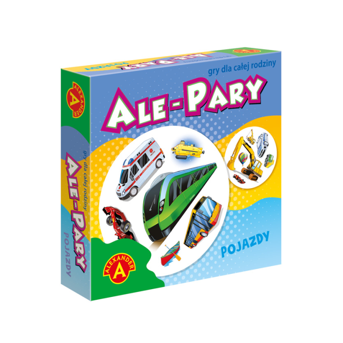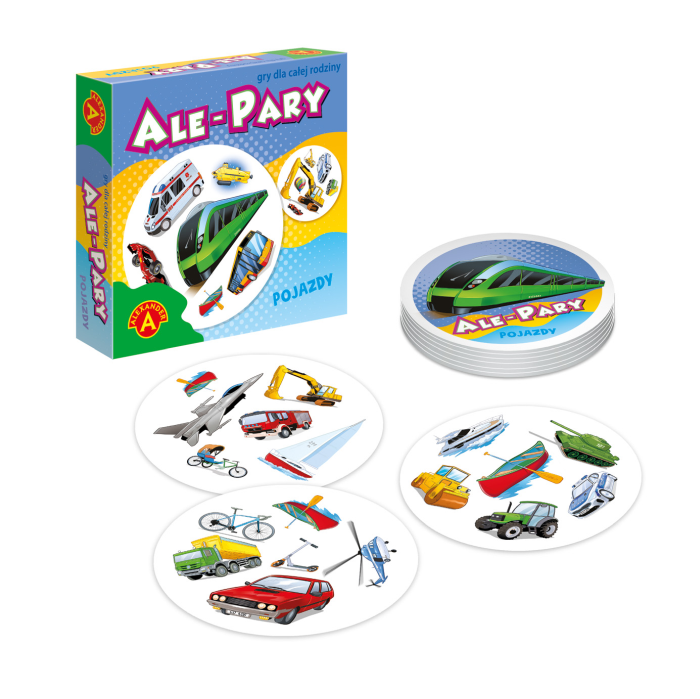 Ale Pary – Pojazdy to prosta i wciągająca gra pamięciowa dla najmłodszych. Polega na odnajdywaniu par identycznych obrazków pojazdów, rozwijając koncentrację i spostrzegawczość. Zestaw zawiera 31 kart z kolorowymi ilustracjami oraz instrukcję.