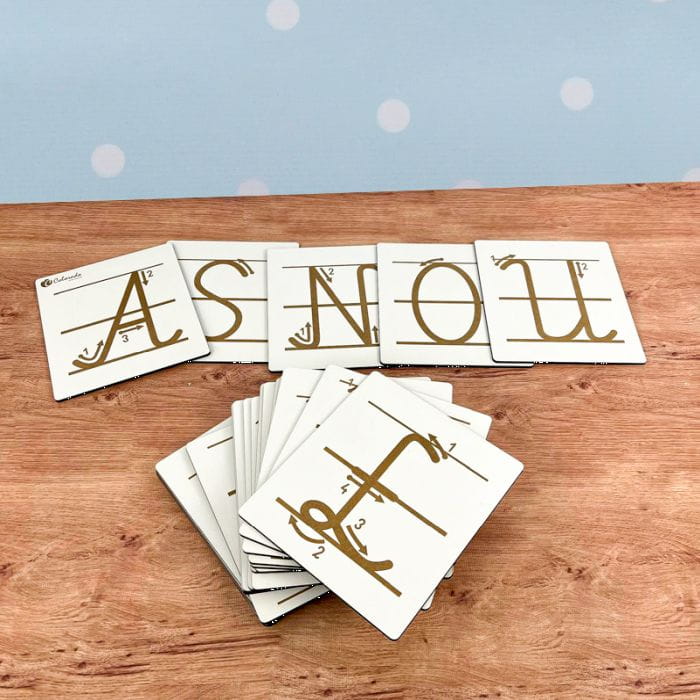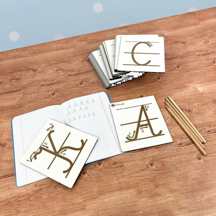Alfabet składa się z tabliczek drewnianych , na każdej tabliczce wygrawerowana jest litera w liniach wraz z prawidłowym kierunkiem jej pisania.