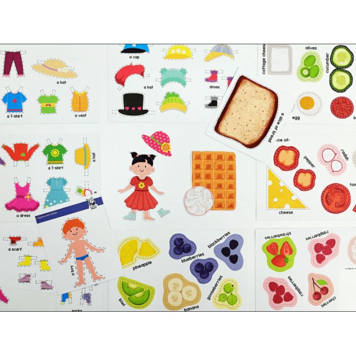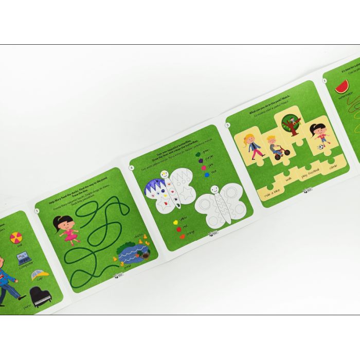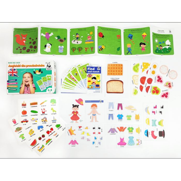 Dzięki różnorodnym kreatywnym materiałom do nauki, takim jak zagadki obrazkowe, książeczka-harmonijka "A Day in a Park", materiały do wycięcia oraz naklejki, dzieci uczą się angielskiego w sposób interaktywny i przyjemny. Zagadki obrazkowe stanowią aktywną formę poznawania angielskiego słownictwa związanego z emocjami, przyrodą, zawodami i codziennymi czynnościami.