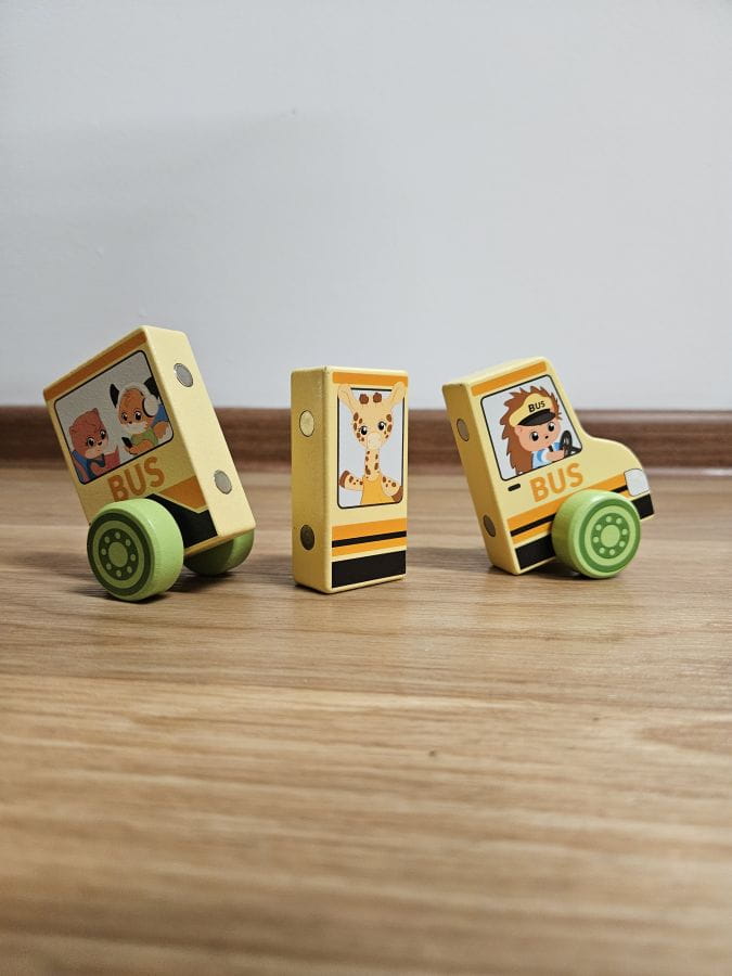 W opakowaniu: pojazd składający się z 3 elementów połączonych magnetycznie i drewnianych kółek