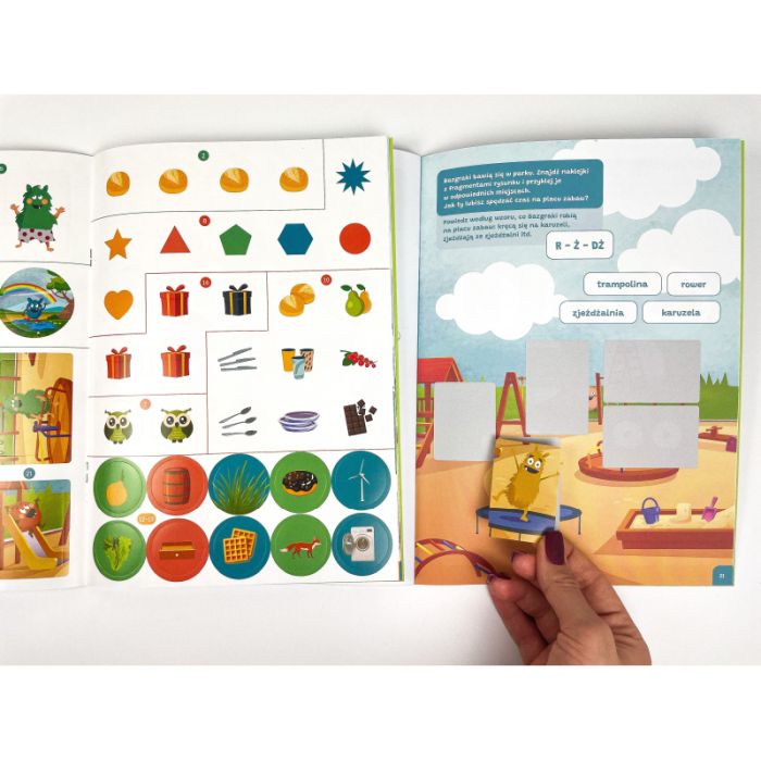 W tej książce znajdziesz polecenia do zabaw ćwiczących odróżnianie podobnie brzmiących głosek oraz trening wymowy różnych głosek. Dzieci będą rozwiązywać łamigłówki, szukać ukrytych przedmiotów i bawić się logopedyczną planszówką. Bogato ilustrowane zadania zachęcają do aktywnego uczestnictwa, a naklejki dodają dodatkowej frajdy podczas rozwiązywania zadań.