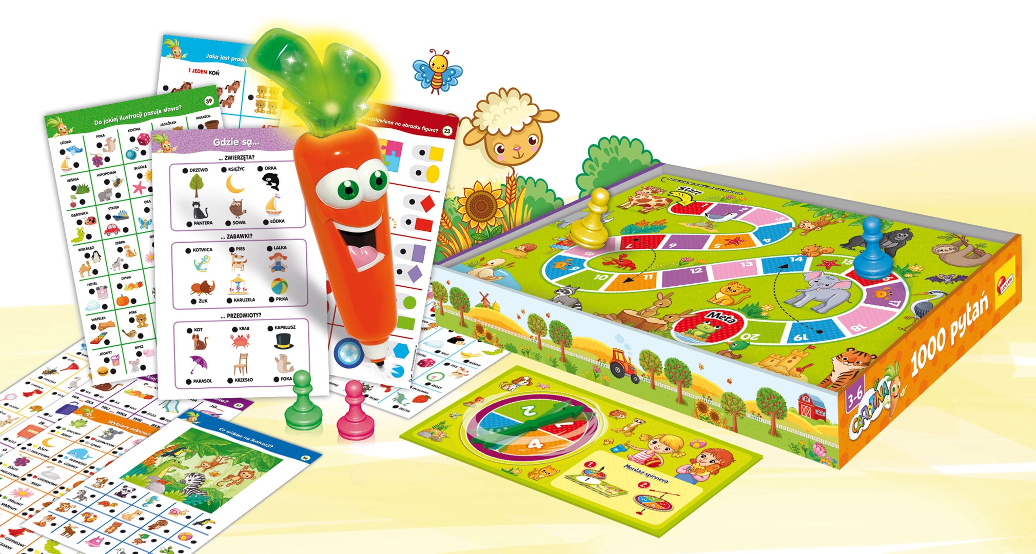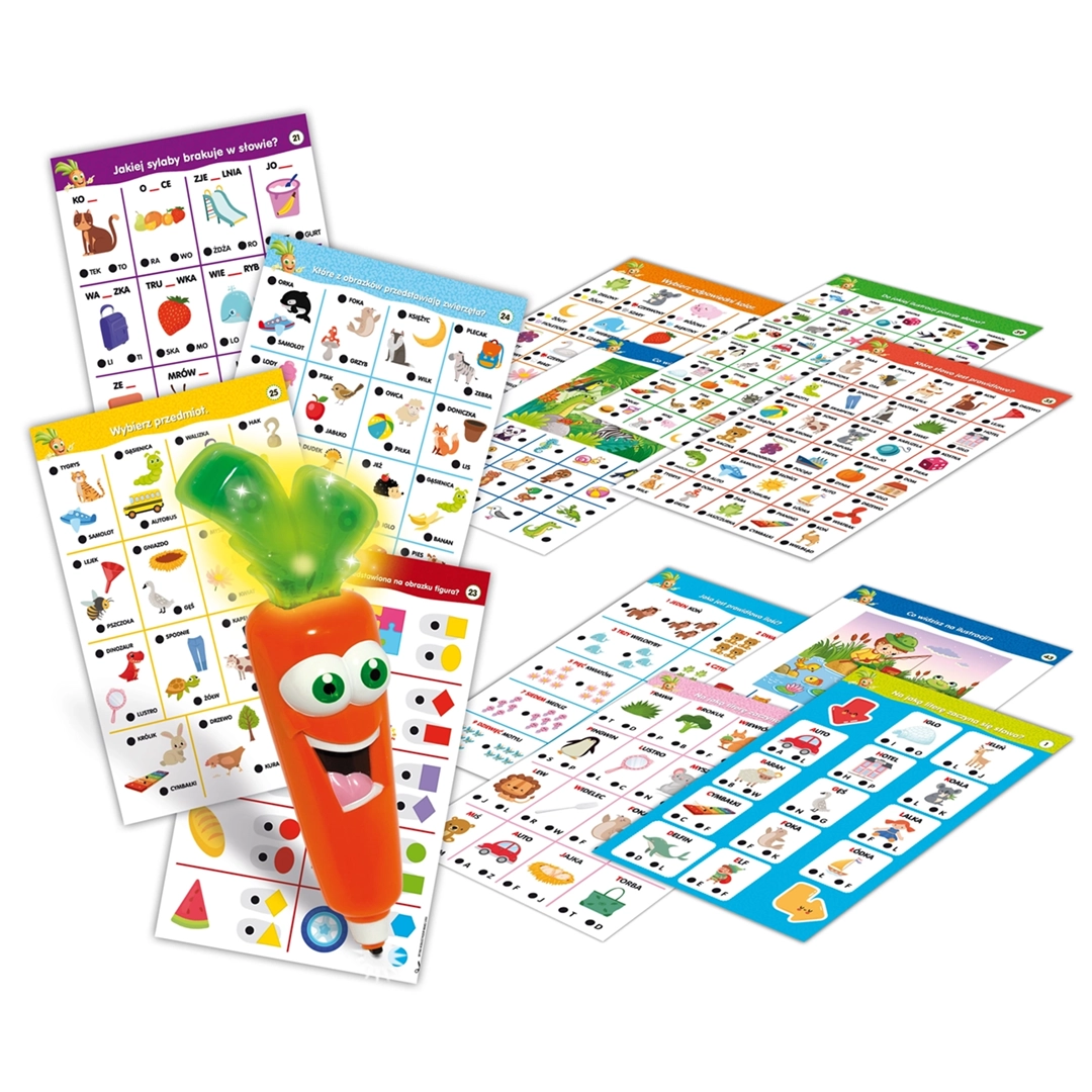 Carotina 1000 Pytań to interaktywna gra edukacyjna stworzona z myślą o dzieciach w wieku przedszkolnym. Łączy zabawę z nauką, oferując bogaty zestaw materiałów dydaktycznych, które wprowadzają maluchy w świat podstawowych pojęć i umiejętności. Centralnym elementem zestawu jest elektroniczny długopis w kształcie marchewki, który reaguje na poprawne odpowiedzi, podświetlając się i wydając wesołe okrzyki, co dodatkowo motywuje dzieci do nauki.