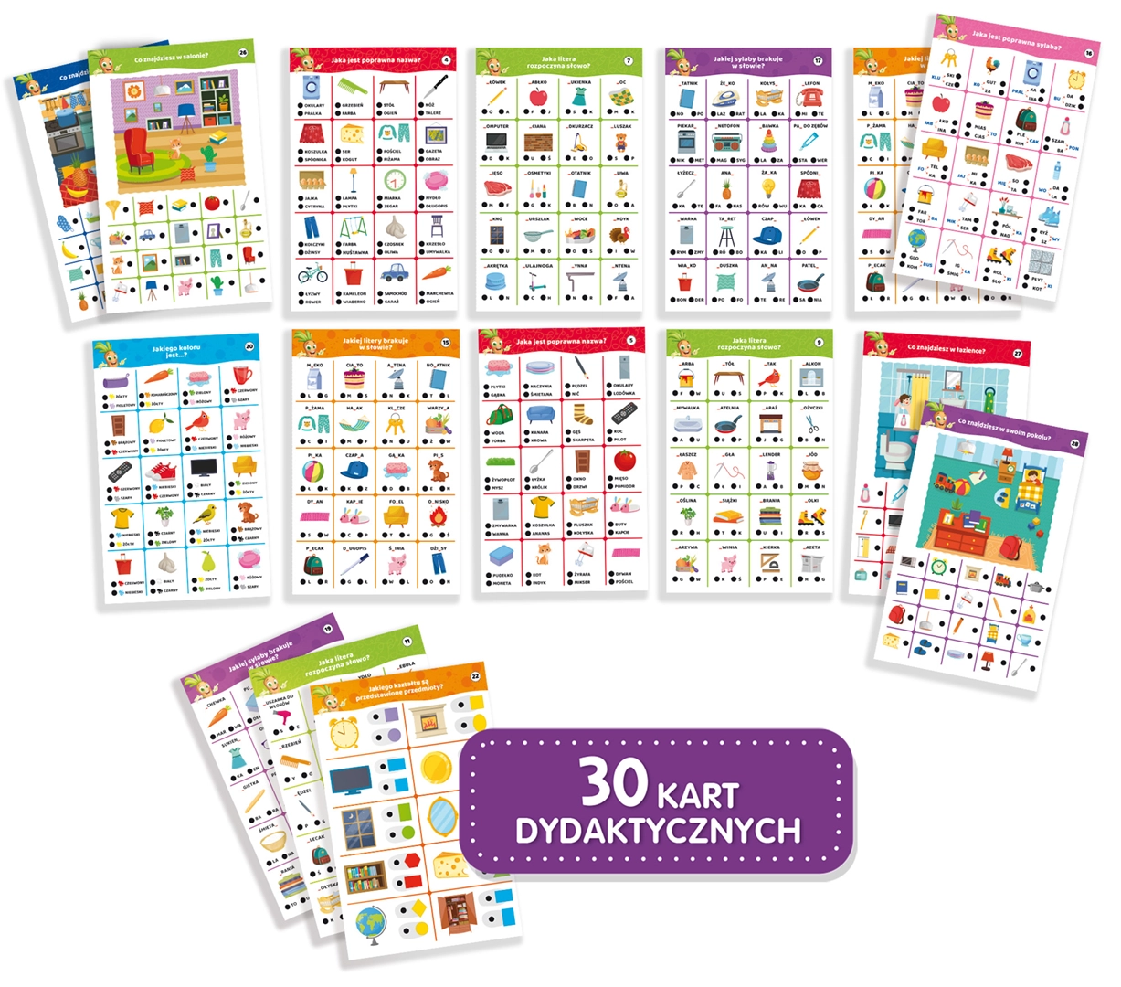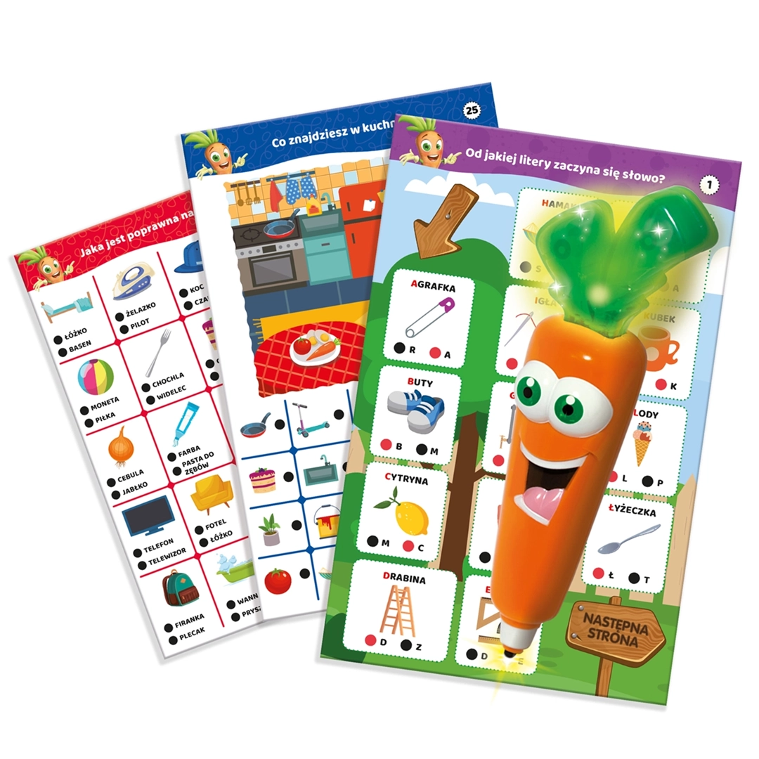 Gra zawiera interaktywną marchewkę Carotina, która pełni rolę przewodnika i motywuje dzieci do nauki poprzez zabawę. W zestawie znajdują się również plansze z pytaniami i ilustracjami, które wprowadzają dzieci w świat domowych przedmiotów i sytuacji.