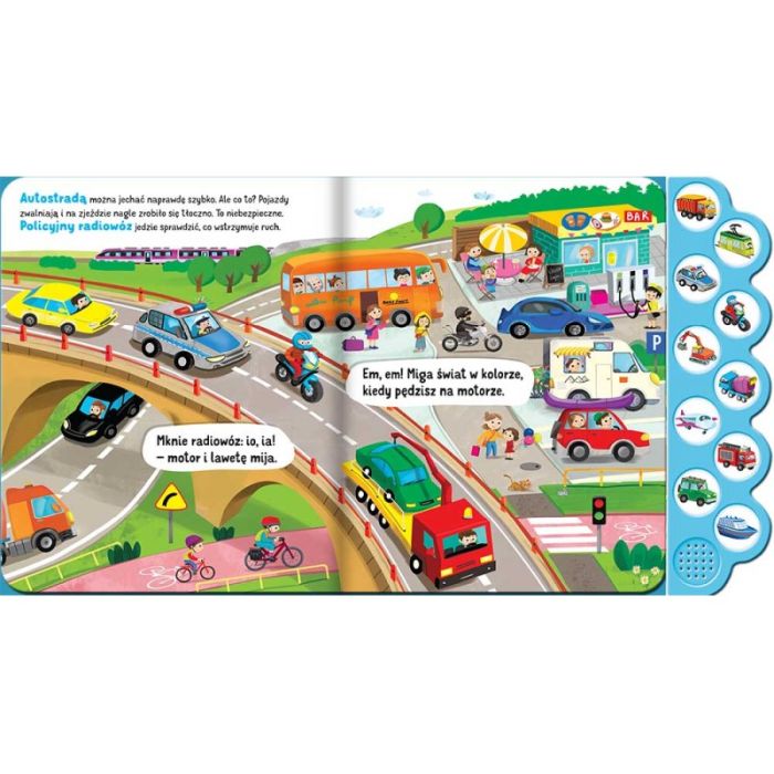 „Co słychać? Pojazdy” sensoryczna książeczka dźwiękowa z 10 przyciskami dla dzieci 0-3 lat