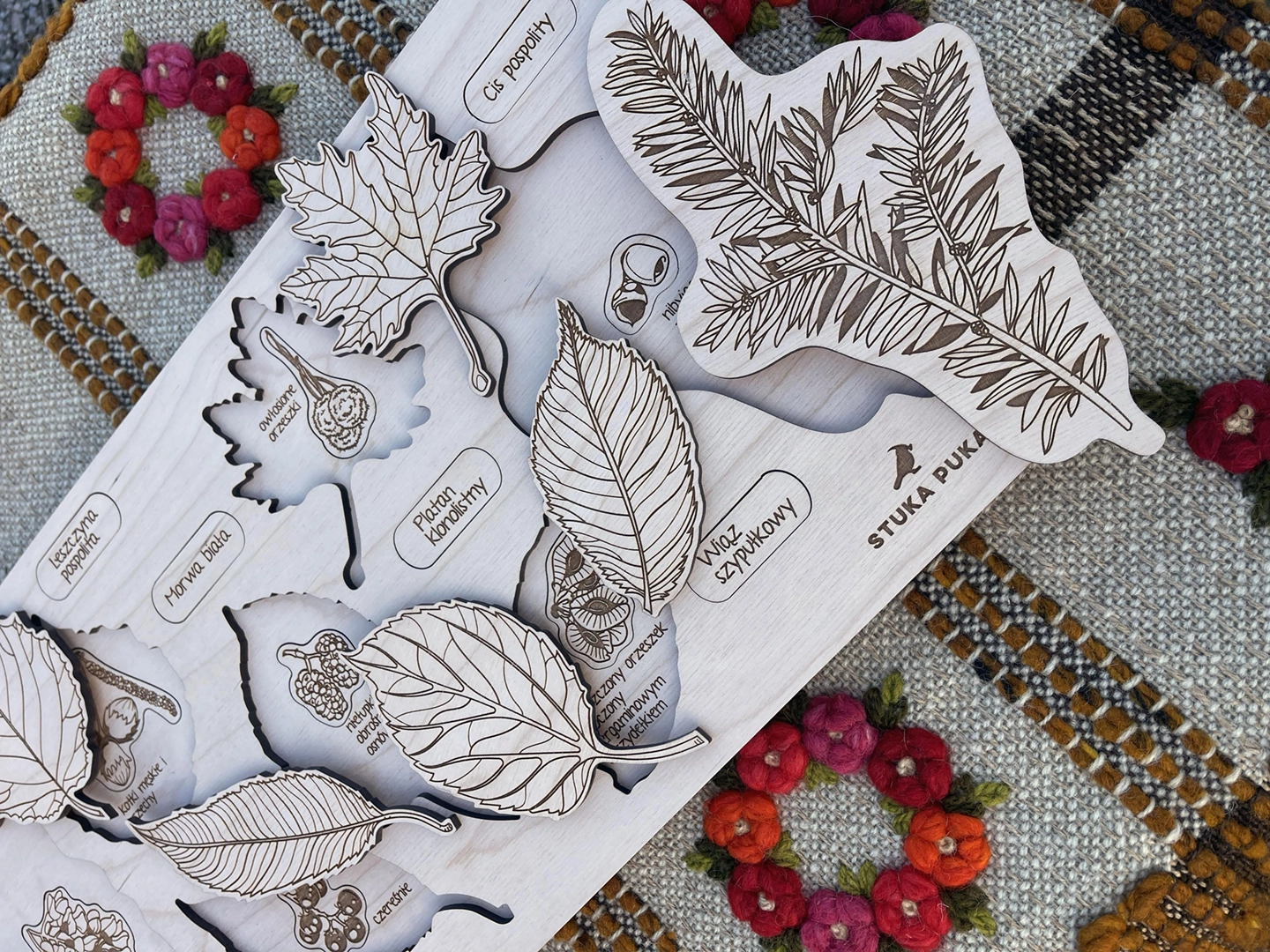 Drewniane puzzle edukacyjne Liście i owocniki – morwa, cis, leszczyna Sounds Wood