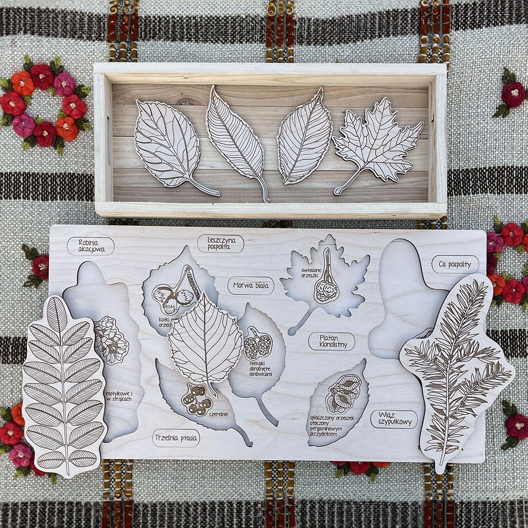 Układanka składa się z 21 puzzli, ramki oraz okładki. Z jednej strony znajdują się liście drzew, z drugiej odpowiadające im owoce – zadaniem dziecka jest dopasowanie ich w odpowiednie miejsca. Ta wersja pozwala nie tylko poznać wygląd drzew, ale także uczy nazw gatunków, porównywania kształtów, rozwija analizę i syntezę wzrokową. Puzzle wykonano z naturalnego drewna i pokryto bezpiecznym lakierem – są solidne, trwałe i przyjazne w dotyku.