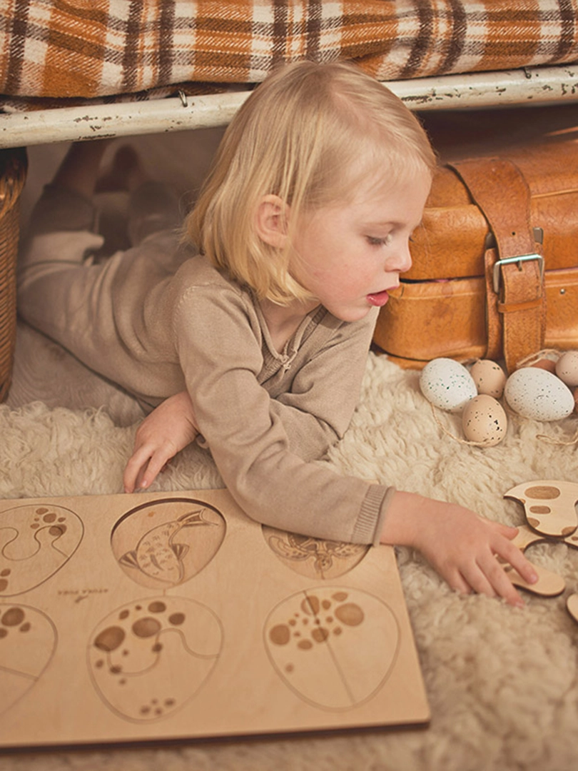 Puzzle drewniane to klasyczna forma nauki przez działanie, a zestaw Co za jaja ma szczególne walory edukacyjne. Rozwija: