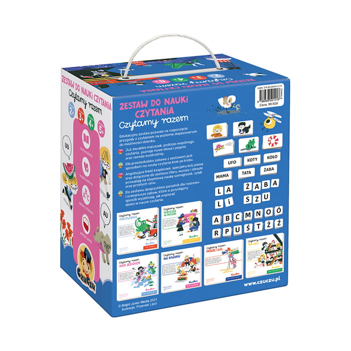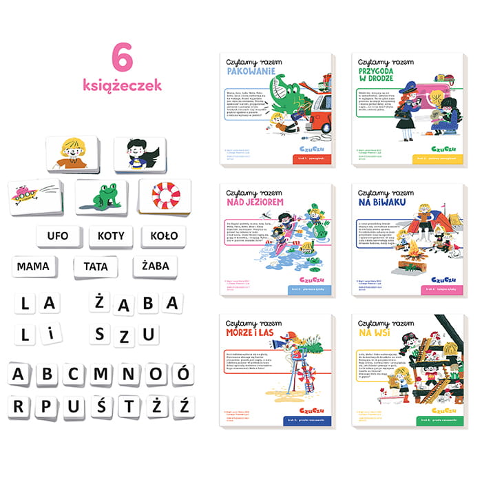 Świat książek pełen jest fascynujących historii, a nauka czytania może stać się dla dziecka wspaniałą przygodą! Nasz unikalny zestaw został stworzony z myślą o czytelnikach w różnym wieku. Najmłodsi będą z uśmiechem słuchać przygód rodziny w trakcie wakacyjnych podróży. Dla starszych dzieci, gotowych na pierwsze kroki w nauce czytania, przygotowaliśmy litery, wyrazy i obrazki, które stanowią doskonały materiał do nauki.
