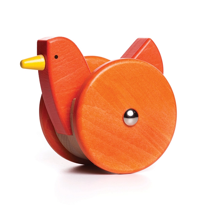 Drewniana kura na kółkach, znana jako wańka wstańka, to zabawka, która zaskakuje dzieci swoim unikalnym wyglądem i ruchem. Ta kura jest inna niż wszystkie – zamiast nóg ma koła, a jej budowa sprawia, że zawsze wraca do równowagi. Dzięki obniżonemu środkowi ciężkości i ukrytemu w brzuchu "złotemu jajku", kura nie przewraca się, lecz buja się i jedzie, naśladując ruchy prawdziwego ptaka. Zabawka przyciąga uwagę dziecka i pobudza jego wyobraźnię, naśladując zachowania prawdziwych kur. Jest to idealna zabawka motywująca do raczkowania oraz wspomagająca rozwój motoryki dużej.