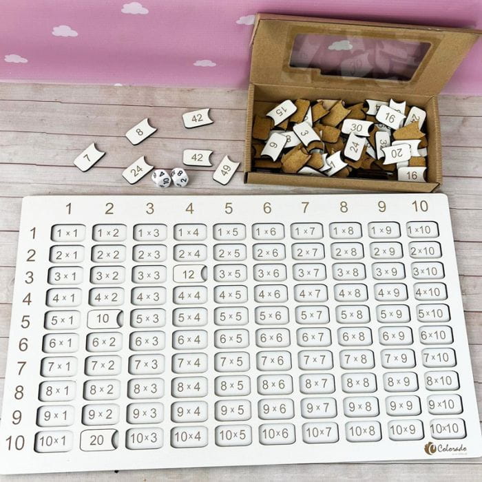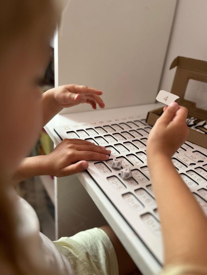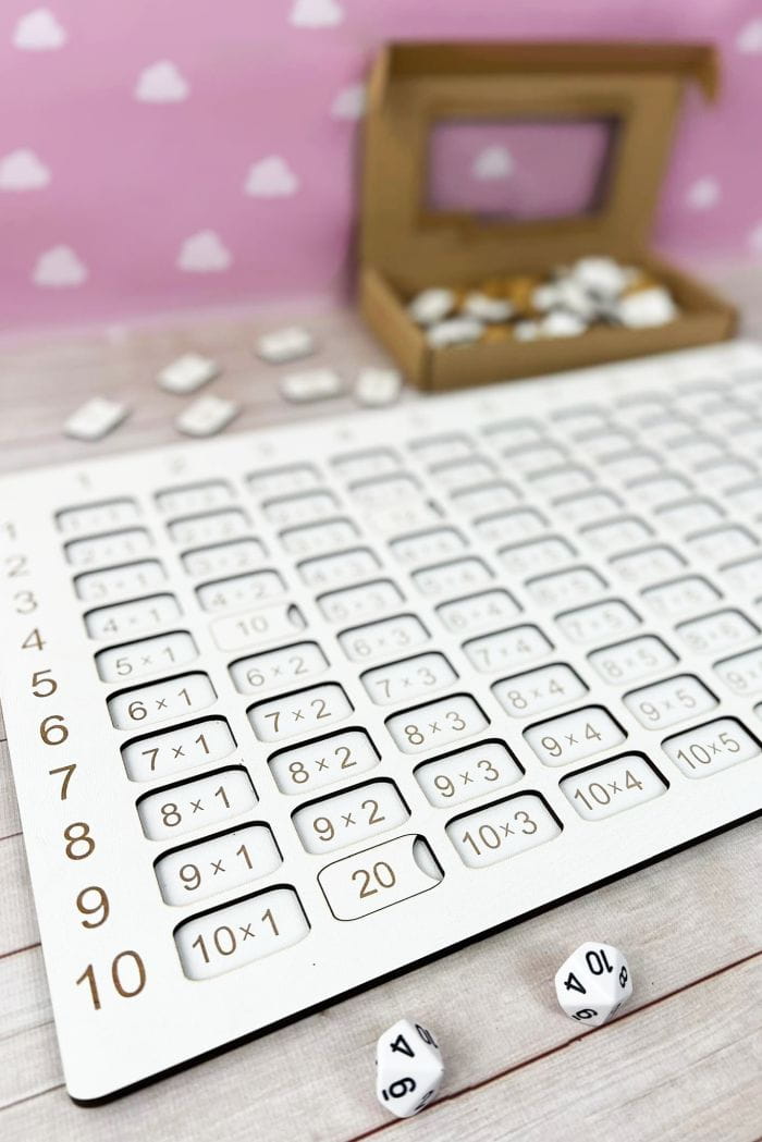 Nauka tabliczki mnożenia nigdy nie była przyjemniejsza – teraz dziecko może przyswajać ją przez zabawę. Służy temu specjalna, drewniana plansza z wyjmowanymi elementami. Maluch ma za zadanie rzucać dwiema kostkami, które wskazują równanie – potem już wystarczy tylko wybrać odpowiedni puzzel z wynikiem i wstawić go w brakujące miejsce. To znacznie ciekawsza forma nauki, niż schematyczne mnożenie mnożnej przez kolejne liczby: wyzwania związane z losowaniem kolejnych działań zwiększają koncentrację i pobudzają umysł do wzmożonej pracy.