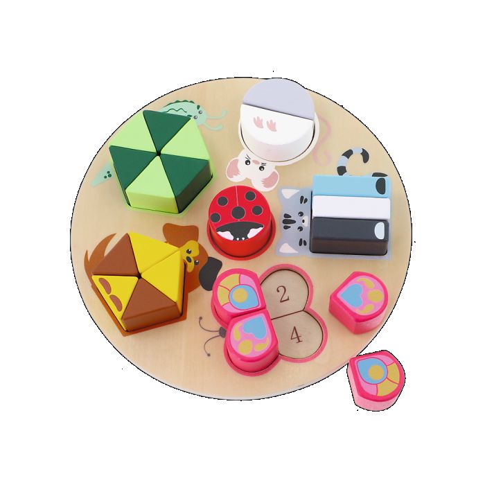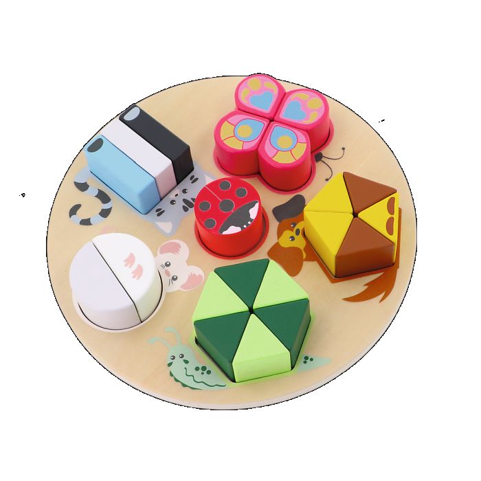 Drewniana układanka pozwalająca poznać zwierzęta: kota, psa, biedronkę, mysz oraz ślimaka. W zestawie znajduje się okrągła podstawka oraz 21 kolorowych klocków.
