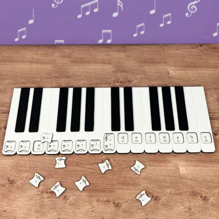 Pomoc edukacyjna wspomoże w szczególności dzieci, które mają problem z zapamiętaniem różnych oznaczeń dźwięków – na poszczególnych polach wygrawerowane zostały zarówno nazwy literowe, jak i solmizacyjne (np. „e” i „mi”). Płytki, które układa się na klawiaturze, zostały podzielone również na klucze basowe i wiolinowe. Dzięki temu maluch może łatwo udoskonalić czytanie oznaczeń nutowych charakterystycznych dla pianina, fortepianu, a nawet: różnorodnych instrumentów stunowych. Młody muzyk szybko zorientuje się, że ułożenie tych samych nut na pięciolinii różni się ze względu na klucz!