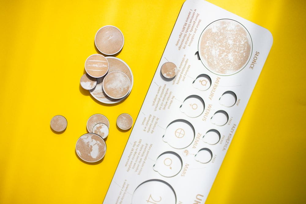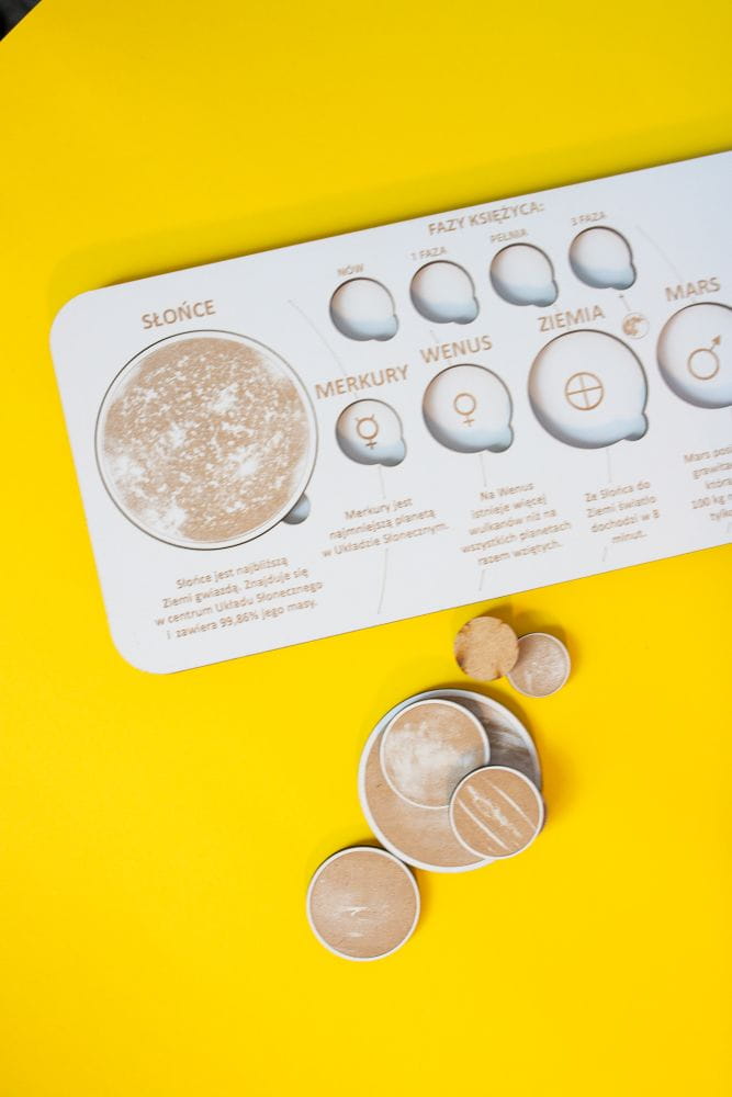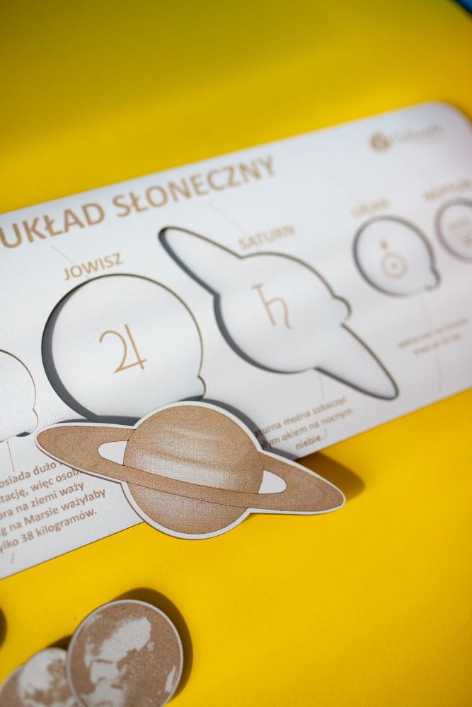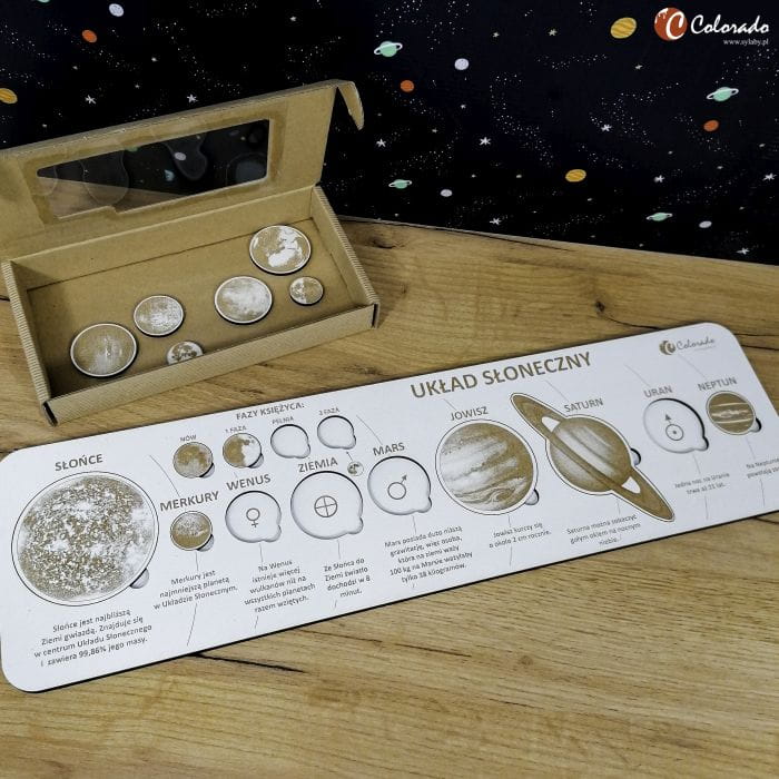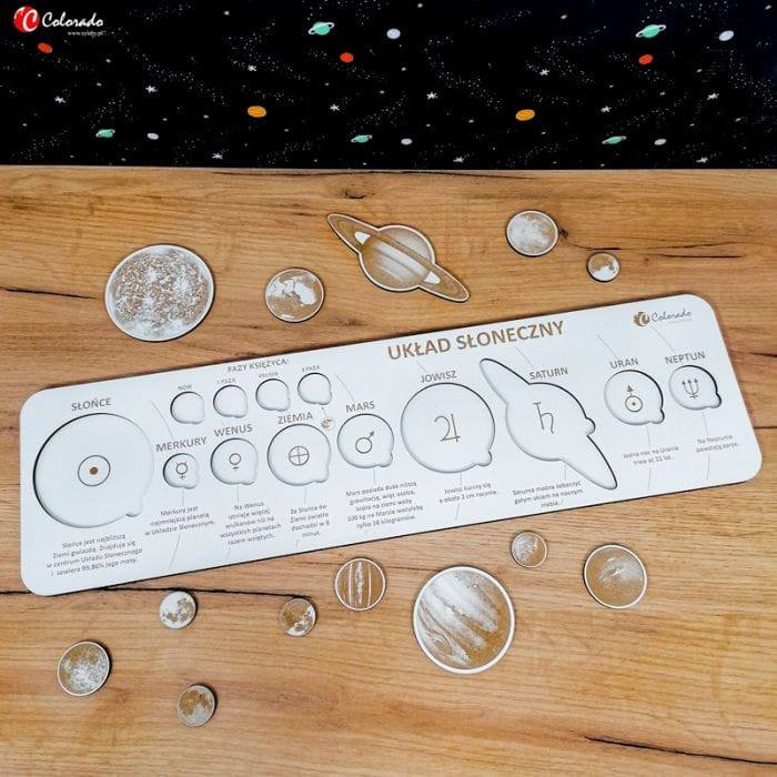 Piękna, ekologiczna plansza tworzy całość z wyciętymi laserowo planetami, Słońcem i fazami księżyca. Po rozrzuceniu elementów na stole, wystarczy już tylko ułożyć puzzle: ułatwia to precyzyjne odwzorowanie charakterystycznych elementów i różnicy w wielkości planet. Kiedy maluch prawidłowo umieści elementy w planszy, może przyswoić zawarte na planszy ciekawostki o poszczególnych elementach… i zabłysnąć na lekcji!