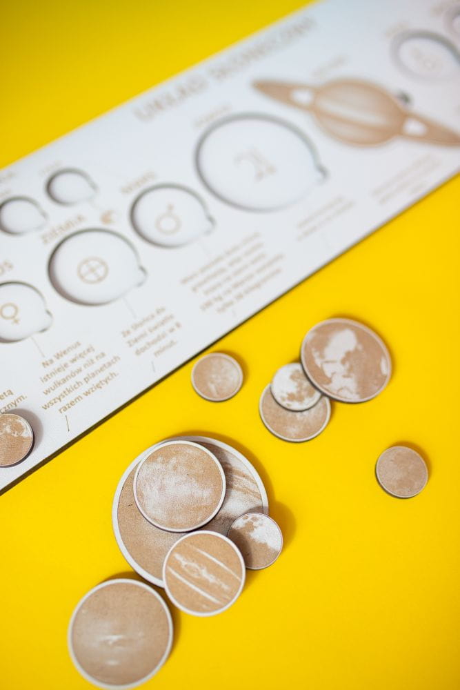 - drewniana tablica z wyciętymi planetami oraz wygrawerowanymi symbolami i ciekawostką dotyczącą każdej z nich,