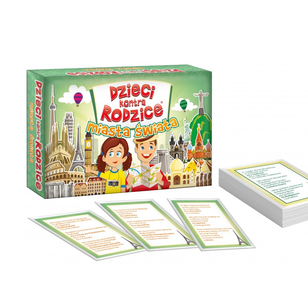 Dzieci kontra Rodzice. Miasta świata to gra karciana od Kangur, w której dzieci i rodzice rywalizują, odpowiadając na pytania o znane miasta. Dla graczy od 7. roku życia.