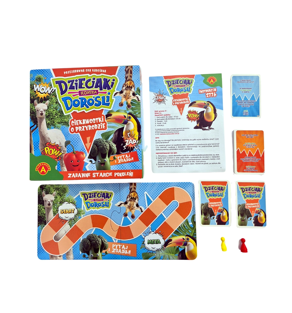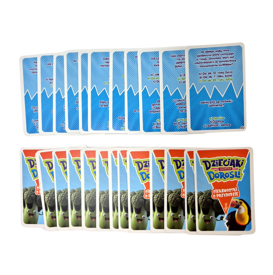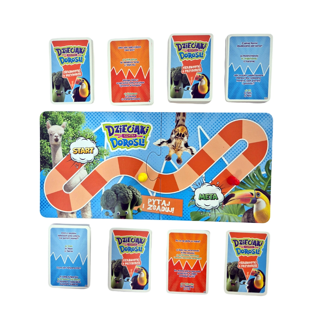 Dzieciaki kontra Dorośli: Ciekawostki o Przyrodzie to idealna gra dla wszystkich miłośników natury. Gracze mają za zadanie odpowiadać na pytania dotyczące zwierząt, roślin, ekosystemów i innych tajemnic przyrody. Gra została zaprojektowana tak, aby dzieci i dorośli mieli osobne zestawy pytań, dostosowane do ich poziomu wiedzy, co pozwala na wyrównaną i angażującą rozgrywkę.