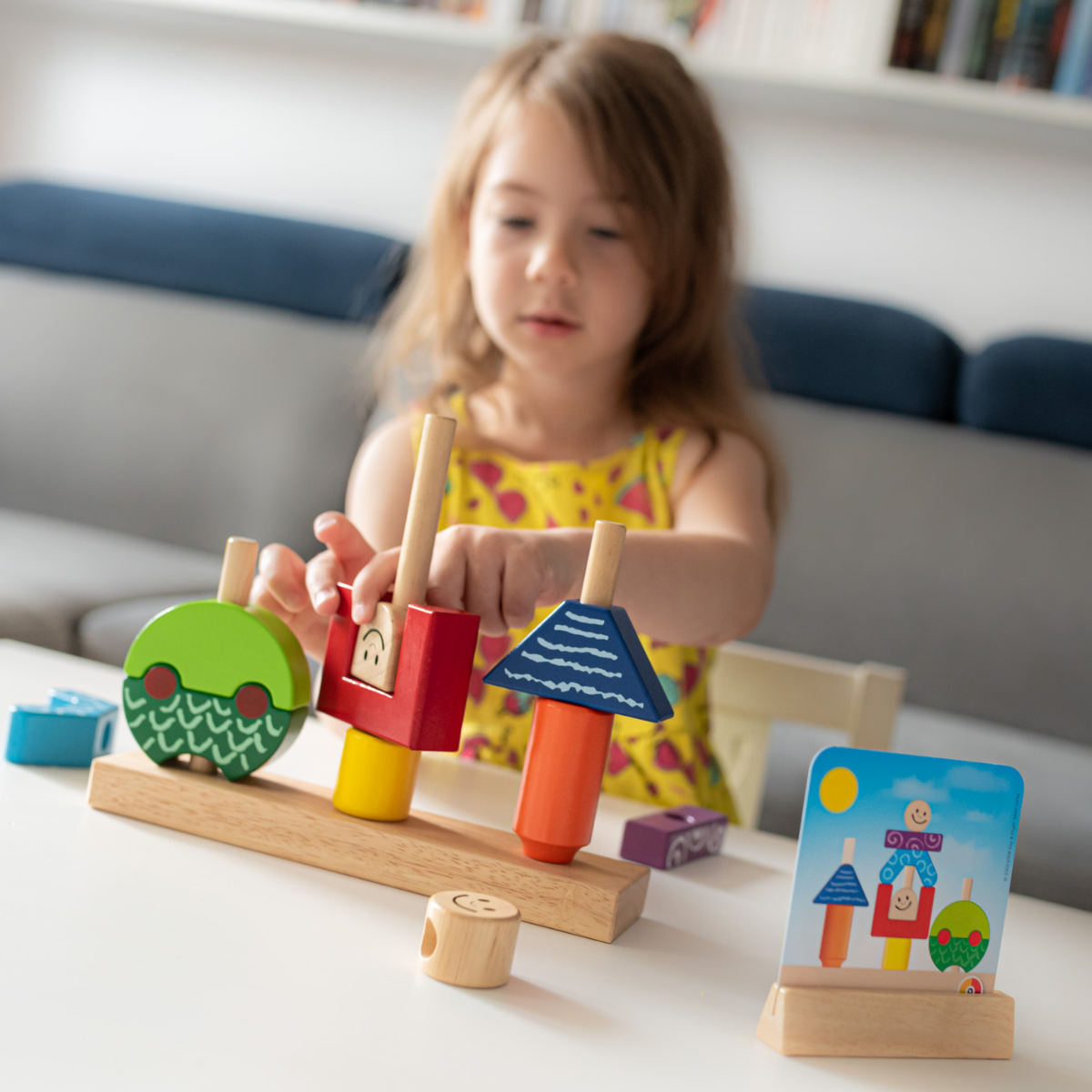 Gra zawiera drewnianą podstawę, 10 kolorowych drewnianych klocków oraz książeczkę z 48 zadaniami i ich rozwiązaniami. Dzięki solidnemu wykonaniu i przyjaznej grafice, gra jest bezpieczna i atrakcyjna dla najmłodszych.