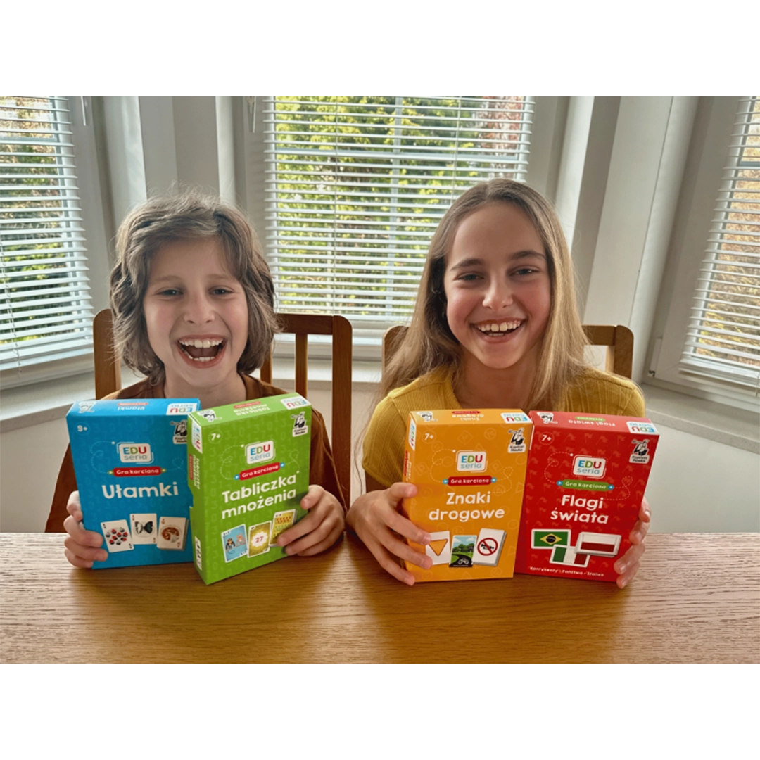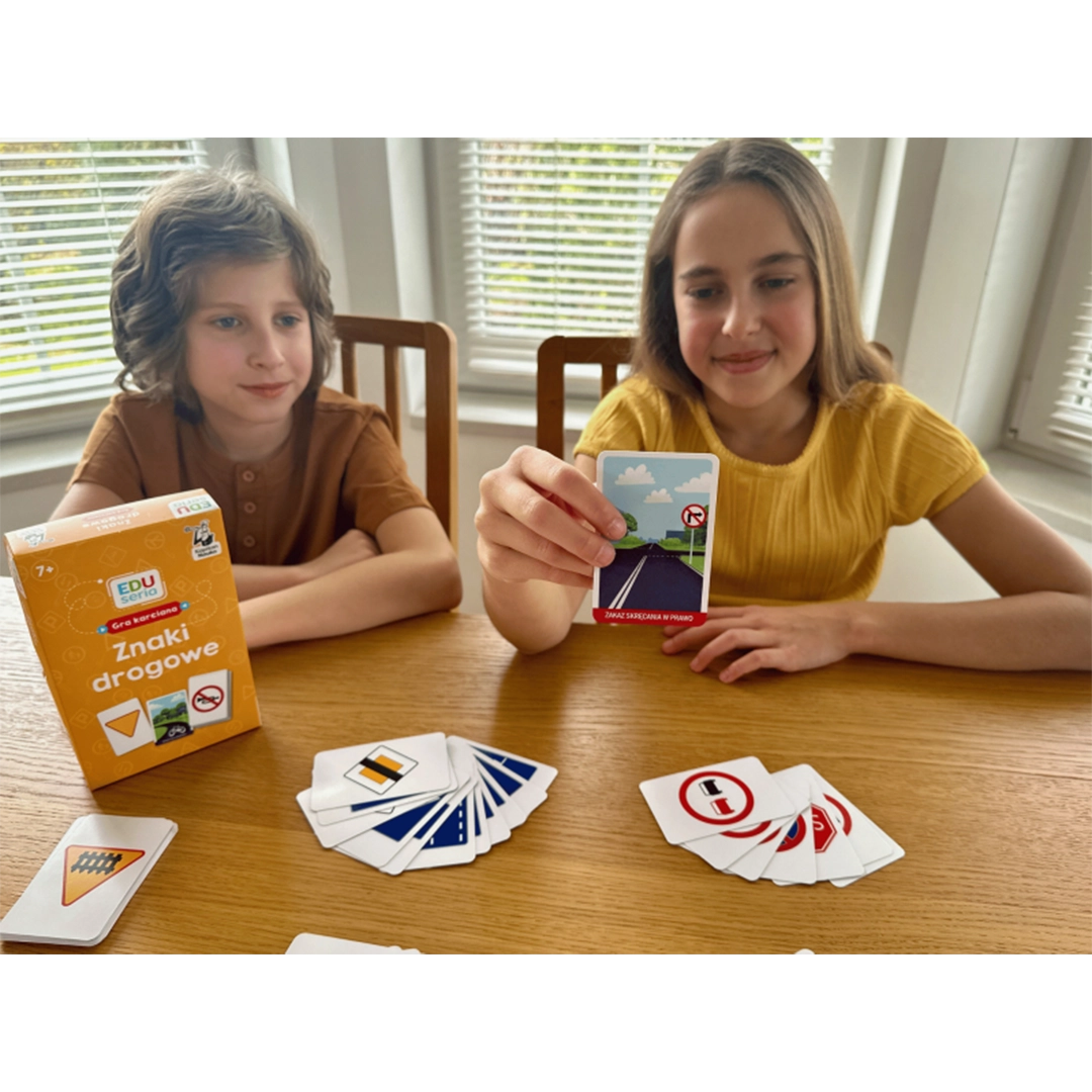 EDUseria znaki drogowe to edukacyjna gra karciana od Kapitan Nauka, która w przystępny i angażujący sposób przybliża dzieciom zasady ruchu drogowego oraz znaczenie najważniejszych znaków. Zestaw składa się z kolorowych kart oraz planszy, a jego zadaniem jest nie tylko zabawa, ale przede wszystkim nauka poprzez aktywność i skojarzenia. Przeznaczona dla dzieci od 6. roku życia, idealnie sprawdzi się w domu, szkole oraz jako pomoc dydaktyczna w zajęciach edukacyjnych.
