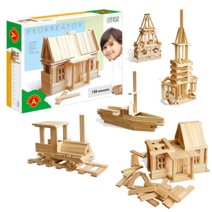 Dzieci uwielbiają tworzyć różne obiekty i konstrukcje z dostępnych im materiałów. Jest to ponadczasowa i bardzo rozwojowa forma zabawy. Ćwiczy kreatywność, koncentrację, cierpliwość, a nawet małą motorykę, dostarczając przy tym mnóstwo radości i satysfakcji. Alexander Eco Fun - Ekokreator (150 elementów) to ekologiczna zabawka, która pozwoli dziecku rozbudzić wyobraźnię i wsiąknąć na wiele godzin. Zestaw składa się z wielu kawałków drewna przypominających niewielkie deski (10cm x 1,9 cm x 0,6 cm), z których można ułożyć niezliczoną ilość różnorodnych konstrukcji. Domek? Pociąg? Okręt? A może jakiś niezidentyfikowany, abstrakcyjny kształt? Wszystko jest możliwe, a jedynym ograniczeniem jest wyobraźnia i… grawitacja. Konstrukcje powstają bez udziału kleju, przez co dziecko uczy się znajdować środek ciężkości obiektu i ostrożnie, ale stabilnie dokładać kolejne części do swojego dzieła. W pudełku znajdują się drewniane elementy (150 szt.), worek oraz album inspiracji. Zabawka nieodpowiednia dla dzieci w wieku poniżej trzech lat.