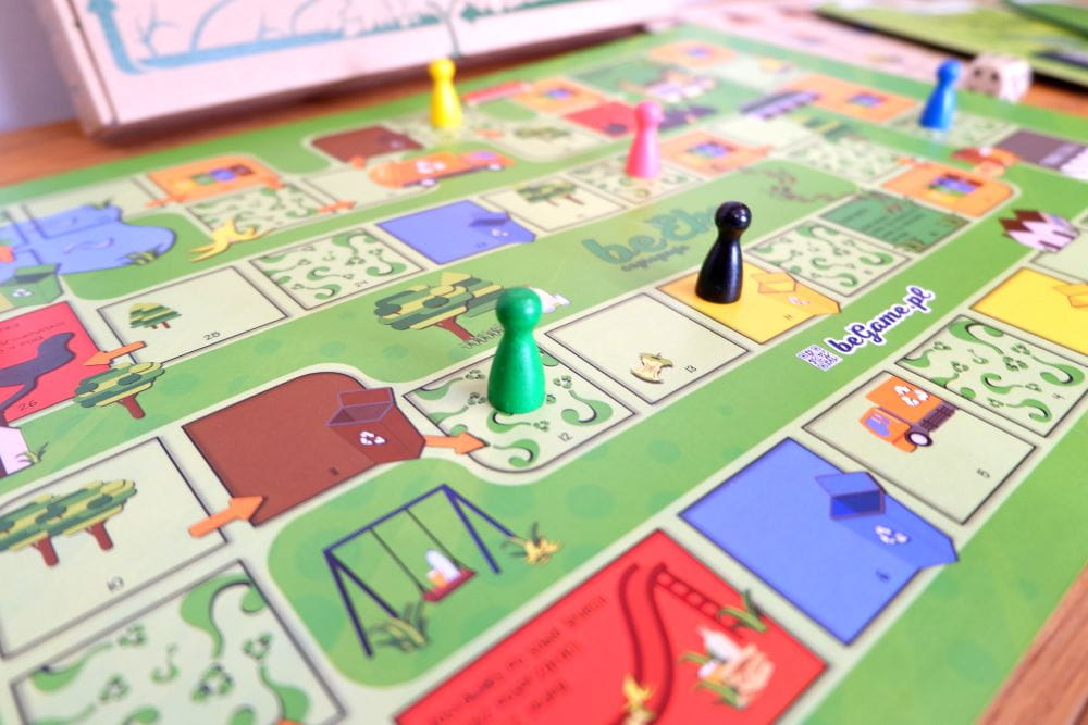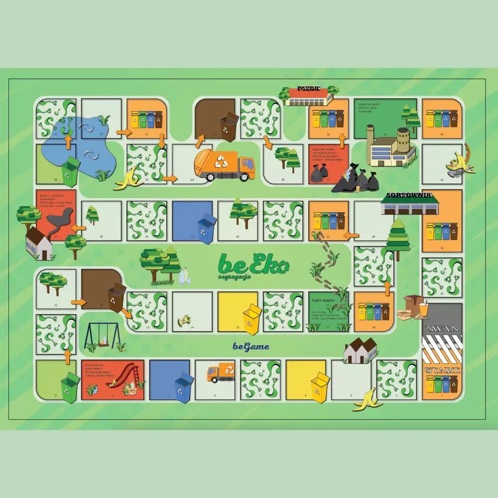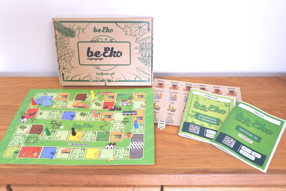 - Plansza do gry w formacie A3, która jest wizualnym przewodnikiem po świecie recyklingu.