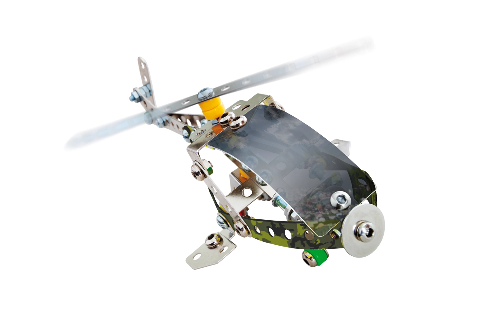 W opakowaniu znajduje się 145 elementów, w tym różnorodne metalowe części o zróżnicowanych kształtach i rozmiarach oraz kolorowe elementy z tworzyw sztucznych. Do zestawu dołączone są również narzędzia do montażu oraz instrukcja, która krok po kroku prowadzi przez proces budowy modelu.