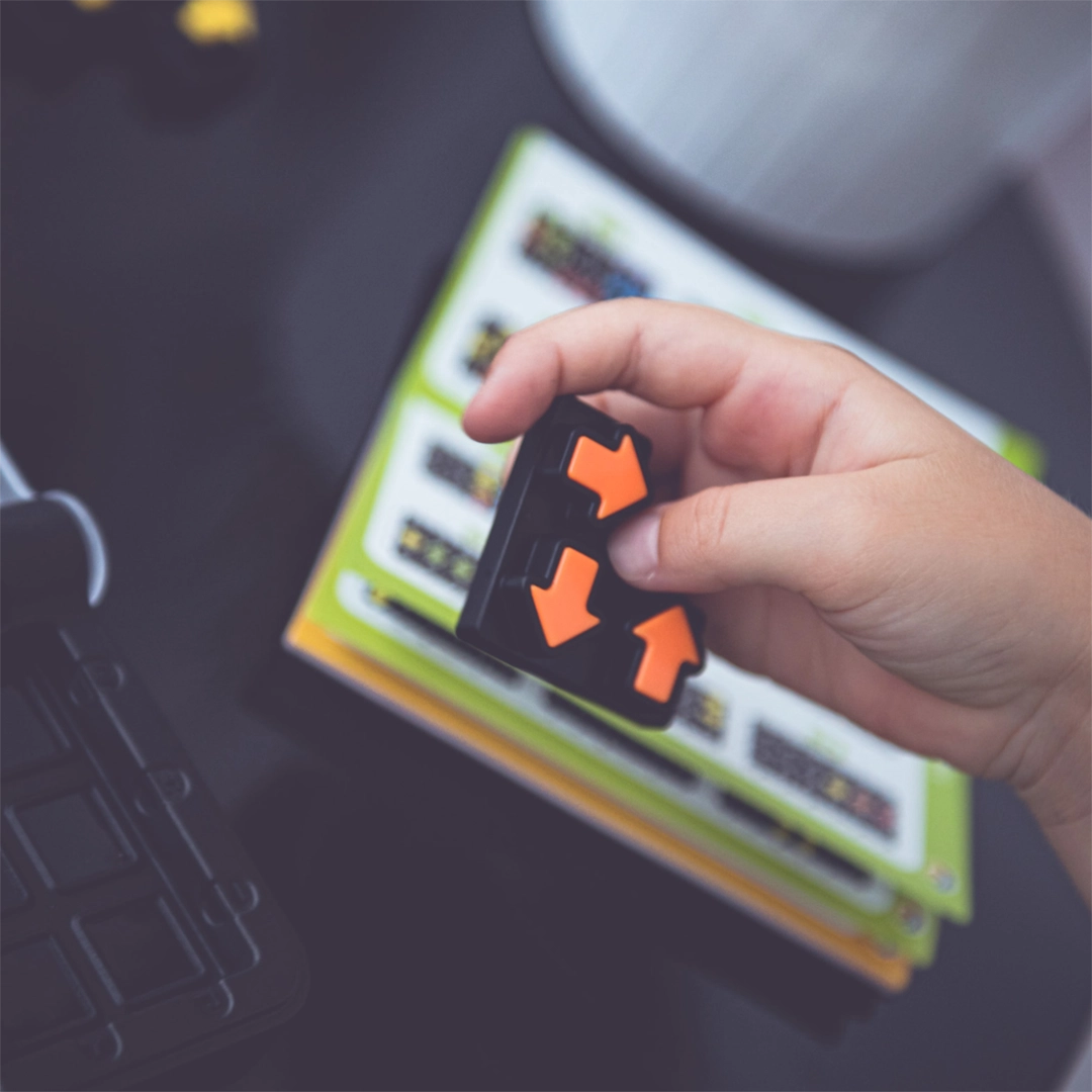 Wybierz jedno z zadań z książeczki i odwzoruj początkowy układ elementów na planszy. Następnie ułóż pozostałe strzałki w taki sposób, aby ich kierunki odpowiadały wskazanym w zadaniu. Zwróć uwagę na to, że obracanie elementów zmienia kierunek strzałek, co dodaje grze dodatkowego wyzwania.