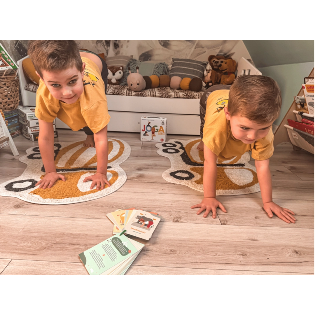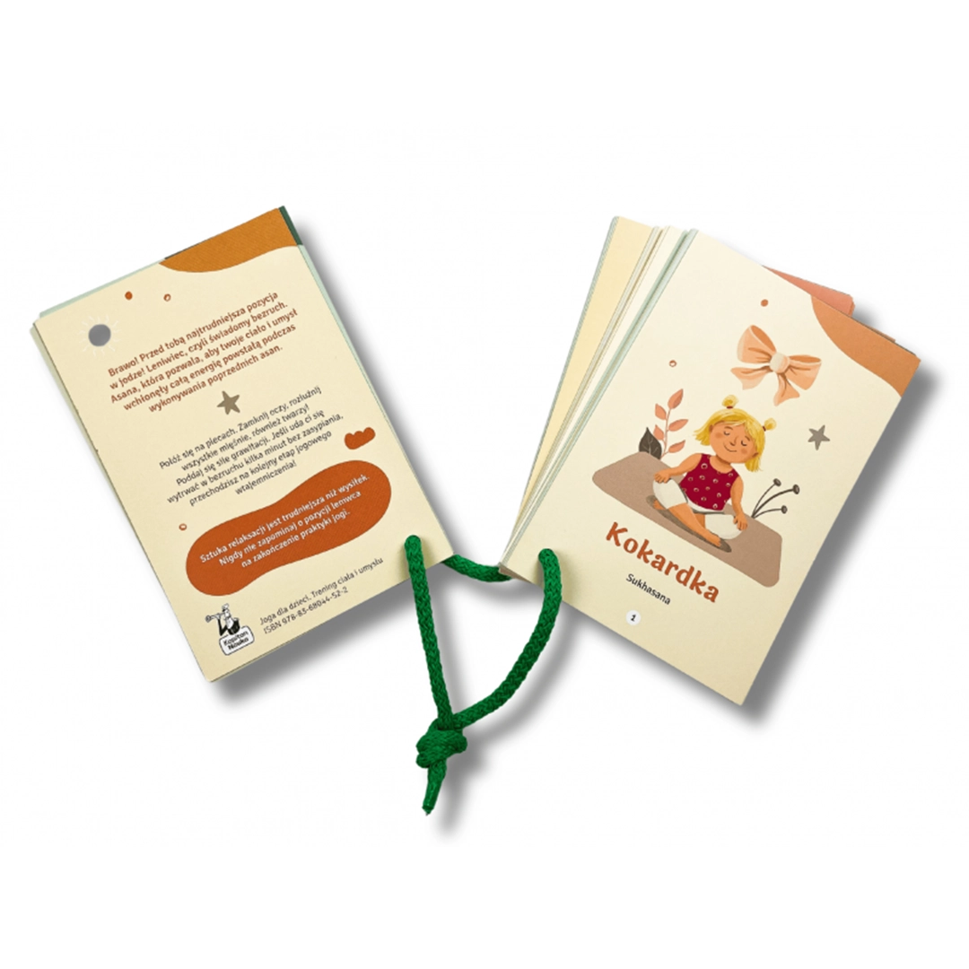 Karty prezentują pozycje jogi inspirowane zwierzętami, elementami przyrody i codziennymi czynnościami. Dzięki prostym ilustracjom i jasnym opisom ćwiczeń, dziecko może samodzielnie lub z pomocą dorosłego naśladować pozycje i wykonywać ćwiczenia. To doskonały sposób na wprowadzenie do codziennej rutyny chwil spokoju, skupienia i wyciszenia – szczególnie ważnych w świecie pełnym bodźców.