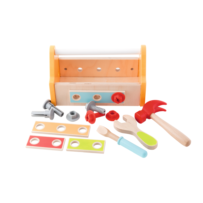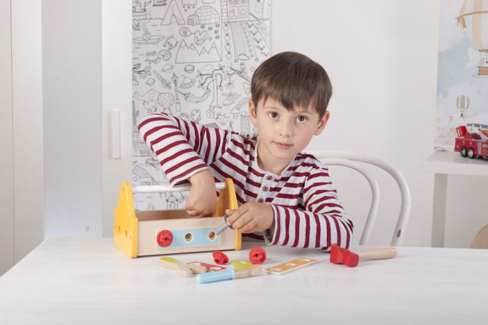 Drewniany kuferek majsterek zagościć powinien w każdym domu. Mały chłopiec i dziewczynka pragną bowiem nie tylko przyglądać się, gdy dorośli budują, remontują lub naprawiają domowe sprzęty. Sami także pragną pomagać w małych pracach remontowych. Maluch chce podawać narzędzia, rozkręcać i skręcać popsute przedmioty. Drewniany zestaw narzędzi dla małego majsterkowicza sprawi, że Wasze dziecko szybko stanie się majstrem, bardzo dobrze przeszkolonym w dziedzinie budownictwa. Ta drewniana zabawka daje możliwość współuczestniczenia Waszej pociechy w zajęciach przeznaczonych dla dorosłych bez obawy, że stanie mu się krzywda. Drewniane narzędzia są bowiem starannie wykończone przez polskich producentów. Pozbawione ostrych kształtów, ręcznie robione śrubokręty i młotki zostały także pokryte atestowanymi farbami i olejami co czyni je eco-friendly. Ta ogólnorozwojowa zabawka pozwoli Waszym pociechom w myśl pedagogiki Montessori poprzez zabawę odkrywać zasady rządzące światem. Zapewni rozwój wyobraźni i kreatywności, cierpliwości i koncentracji oraz małej motoryki i logicznego myślenia.