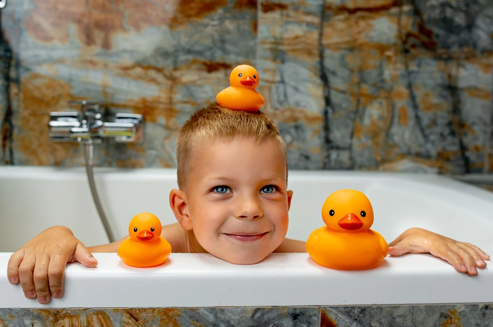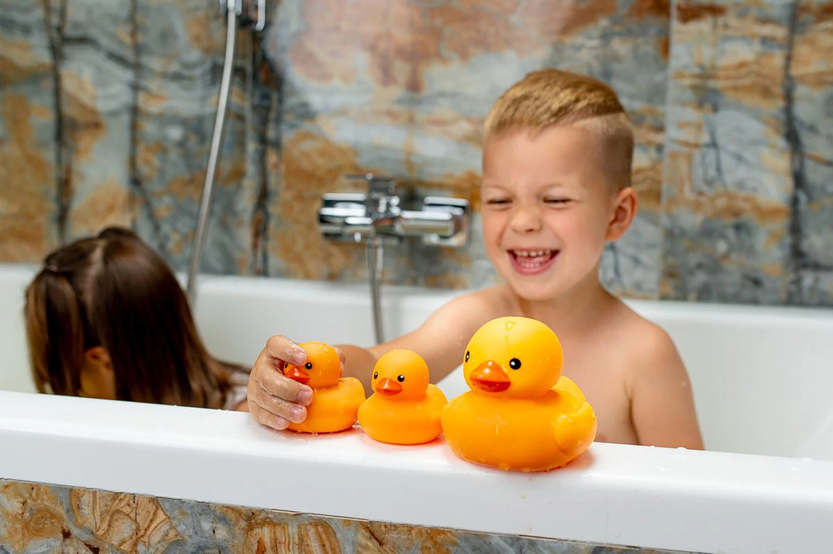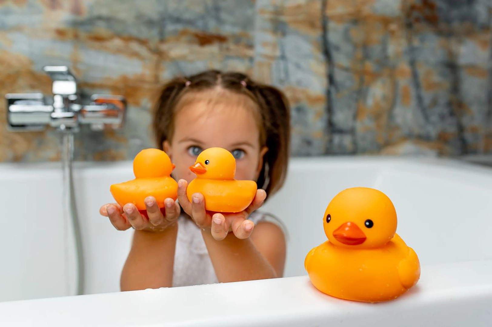 Przygotowanie kąpieli: Napełnij wannę wodą o odpowiedniej temperaturze dla Twojego dziecka. Upewnij się, że woda jest wystarczająco głęboka, aby kaczuszki mogły swobodnie unosić się na jej powierzchni.