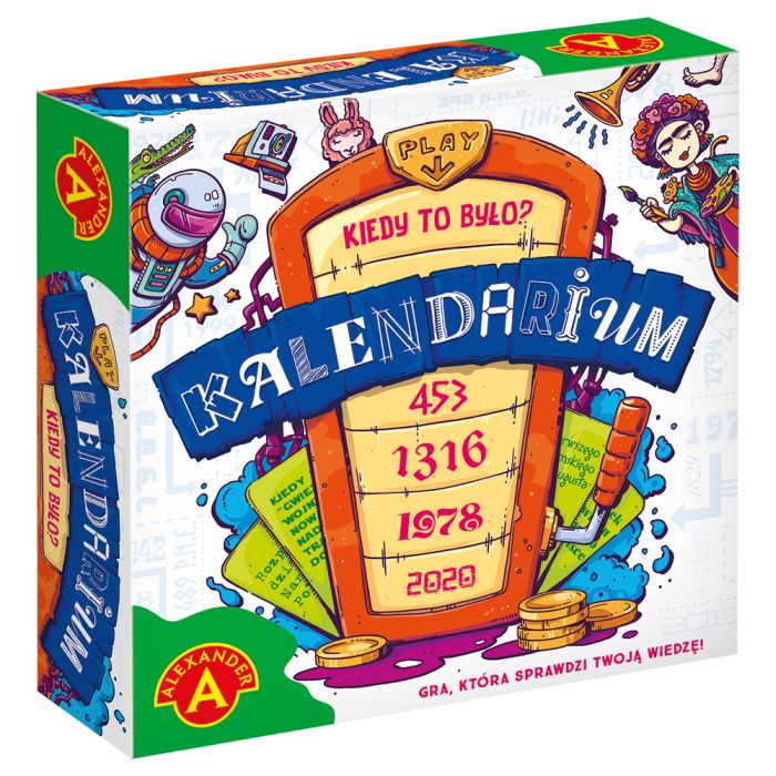 Kalendarium – Alexander to edukacyjna gra planszowa dla dzieci od 10 lat, która w przyjemny sposób uczy pojęcia czasu. Dzięki zabawie dzieci poznają dni tygodnia, miesiące, pory roku oraz uczą się poprawnego odczytywania dat.