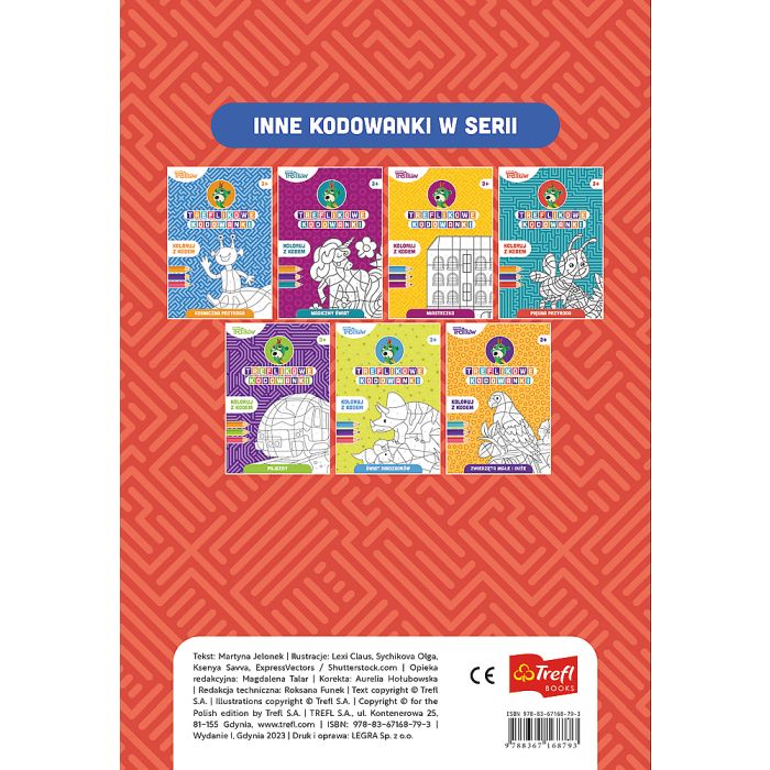 Sięgnijcie również po inne książki z serii Treflikowe kodowanki. Koloruj z kodem: Zwierzęta małe i duże, Magiczny świat, Kosmiczna przygoda, Piękna przygoda .