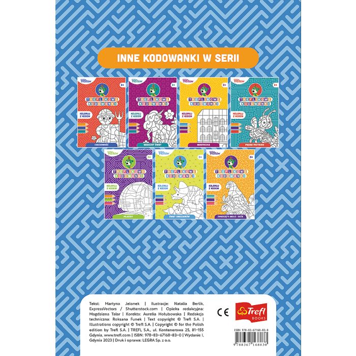 Sięgnijcie również po inne książki z serii Treflikowe kodowanki. Koloruj z kodem: Zwierzęta małe i duże, Magiczny świat, Codzienność , Piękna przygoda .