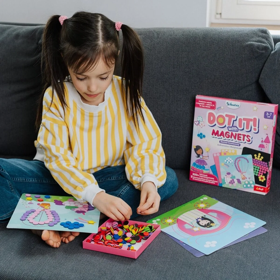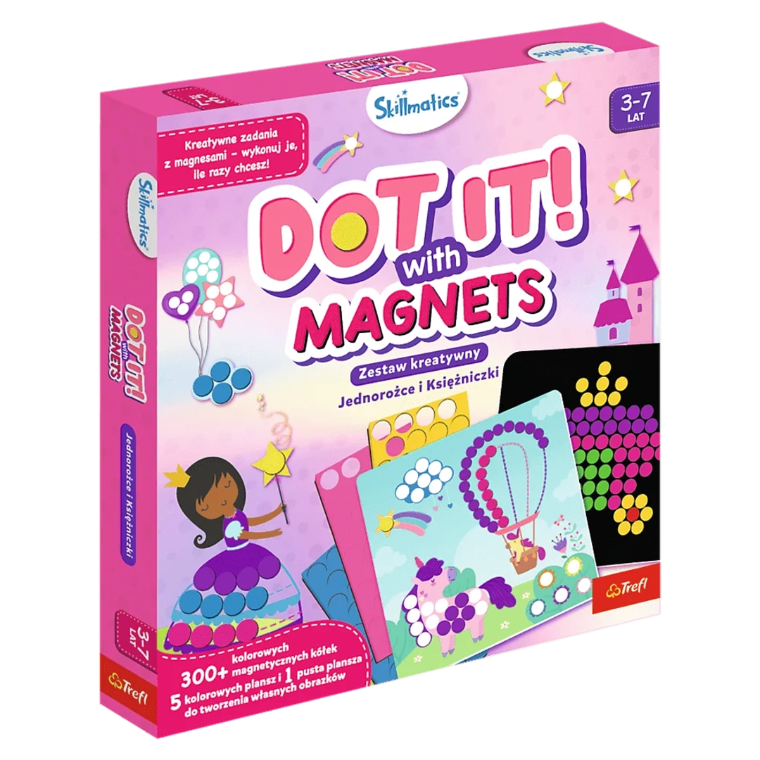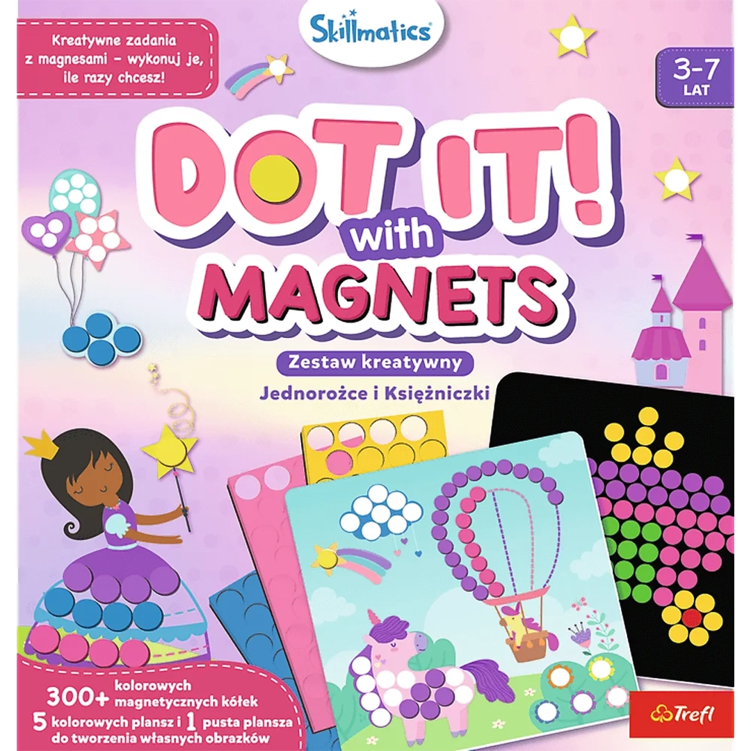 Trefl Skillmatics Dot It! With Magnets – Jednorożce i Księżniczki to kreatywny zestaw magnetyczny, który przenosi dzieci do magicznego świata pełnego baśni, kolorów i fantazji. Dzięki magnetycznym kółeczkom i przygotowanym planszom maluchy mogą tworzyć własne, pełne uroku obrazki z jednorożcami, księżniczkami i bajkowymi sceneriami.