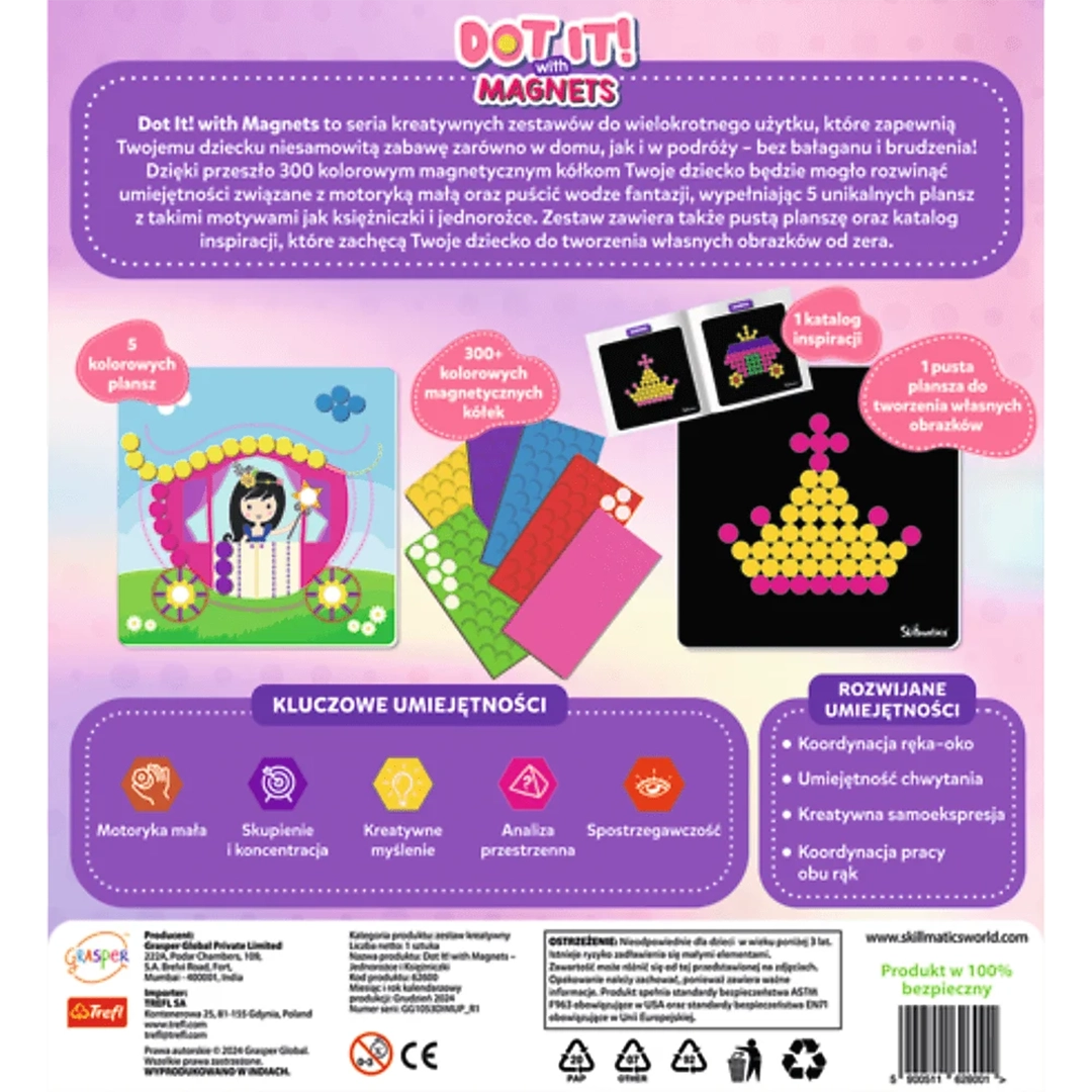Trefl Skillmatics Dot It! With Magnets – Jednorożce i Księżniczki to doskonały zestaw kreatywny dla dzieci, które kochają baśniowy świat magii. Pozwala rozwijać wyobraźnię i zdolności manualne, jednocześnie zapewniając bezpieczną, czystą i wartościową zabawę. Idealny jako prezent, który zachwyci każdego małego miłośnika kreatywnych układanek.