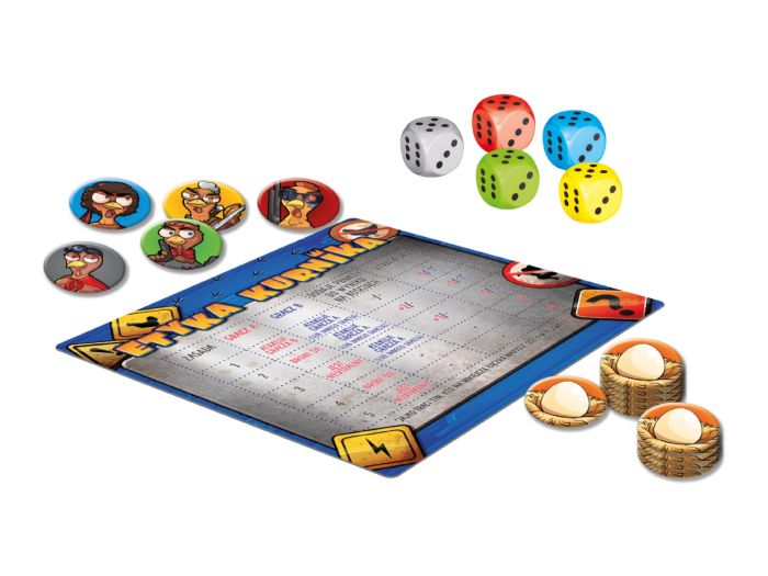 O kurka wodna, co to się dzieje w tym kurniku?! Ale jaja! Koguty rozpętały istny armageddon! Wygląda na to, że król kurnika może być tylko jeden - czy będziesz to Ty? Pokaż, na co Cię stać! Pink Frog Król Kur to fantastyczna gra taktyczna, która dostarczy mnóstwo śmiechu i nieco zgrzytania zębami wszystkim biorącym udział w rozgrywce (grać może od trzech do pięciu osób). Każdy gracz wciela się w jednego z kogutów pragnących zdobyć władzę nad kurnikiem oraz bezcenny totem króla kur. Jednak by to osiągnąć, trzeba się nieźle natrudzić - pozostali pretendenci muszą zostać wyeliminowani! W każdej rundzie toczona jest walka pomiędzy kogutami, w której można się bronić, atakować wybranego przeciwnika lub pozostać neutralnym. W wyniku licznych potyczek gracze będą tracić swoje jajka, a ci, którzy stracą wszystkie - zostaną wyeliminowani! Gdy kurz opadnie, ostatni stojący na placu boju zostanie niekwestionowanym królem kur! Zasiądźcie wspólnie do stołu i razem doświadczcie kurnikowego chaosu! W pudełku znajdują się karty walki (90 szt.), karty kurzej supermocy (20 szt.), kości walki (10 szt.), żetony jajek (30 szt.), żetony kogutów (5 szt.), totem króla kur, karta zasad i etyki kurnika oraz instrukcja. Powodzenia!