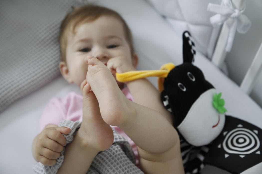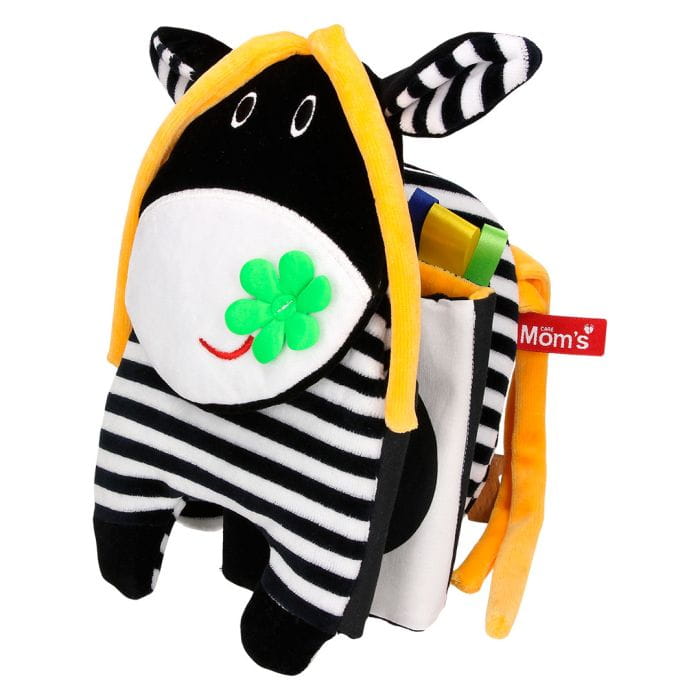 Dzieci uwielbiają zwierzątka, dlatego ten motyw jest często wykorzystywany przez producentów zabawek. Jeśli dodatkowo przy tym zabawka ma walory edukacyjne - trudno znaleźć lepsze rozwiązanie. Dzieci poznają świat za pomocą wszystkich zmysłów. Im bardziej będą one stymulowane, tym lepiej - rozwiną się szybciej i lepiej. Zabawka w postaci książeczki sensorycznej wpływa korzystnie na dotyk, wzrok i słuch dziecka, wspierając jego rozwój sensoryczny. Mięciutka książeczka w kształcie sympatycznej krówki to doskonały sposób nie tylko na zabawę, ale także naukę i wyciszenie: przed snem lub w stresujących sytuacjach. Książeczka ma harmonijkową postać, a jej wymiary i kształty są dopasowane do maleńkich rączek dziecka. Dzięki temu bez problemu będzie mogło ją chwytać i bawić się nią w taki sposób, jaki uzna za najlepszy dla siebie. Dzięki wykorzystaniu miękkich, bezpiecznych, a przy tym atrakcyjnych dla malucha materiałów, jego ciekawość zostanie jeszcze bardziej rozbudzona. Tym samym dziecko chętniej będzie sięgać po taki przedmiot, co przełoży się korzystnie na jego rozwój. Poznawanie świata przez dotyk to jeden z najcenniejszych sposobów na rozwój. Wykorzystanie szeleszczących ilustracji dodatkowo pobudza ciekawość i zwraca uwagę malucha.