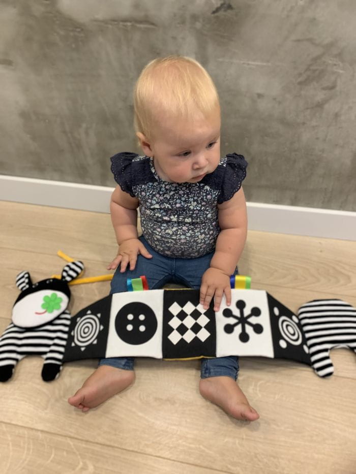 Króweczka książeczka sensoryczna to kontrastowa zabawka dla niemowląt, która rozwija zmysł wzroku, dotyku i słuchu. Miękka osłona łóżeczka stymuluje rozwój dziecka od pierwszych dni życia, zapewniając bezpieczną zabawę i edukację sensoryczną.