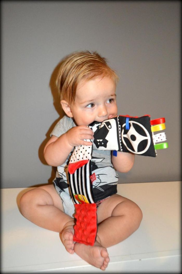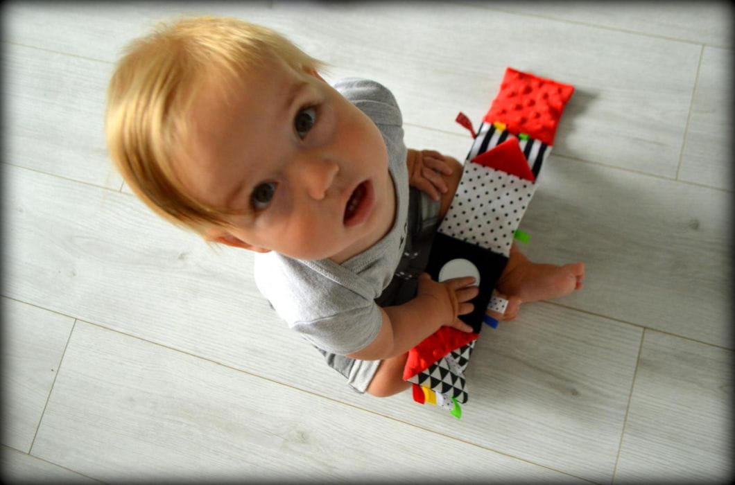 Książeczka sensoryczna została zrobiona z mięciutkich, przyjemnych w dotyku i bezpiecznych dla malucha materiałów, dzięki czemu użytkowanie jej przynosi same korzyści. Wyraziste kolory i atrakcyjne materiały sprawiają, że książeczka będzie atrakcyjna i ciekawa dla malucha. Czarno-biało-czerwona książeczka, dzięki kontrastowym kolorom, jest łatwa i przyjemna w odbiorze przez dziecko, którego wzrok dopiero się rozwija.