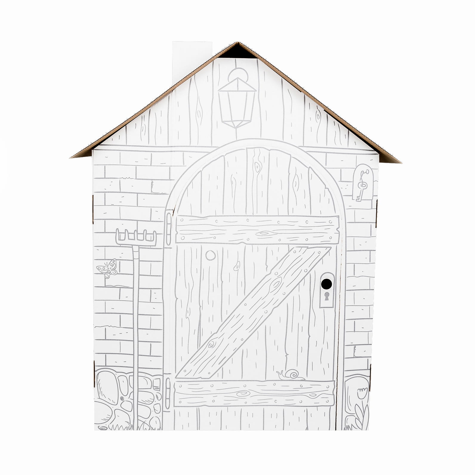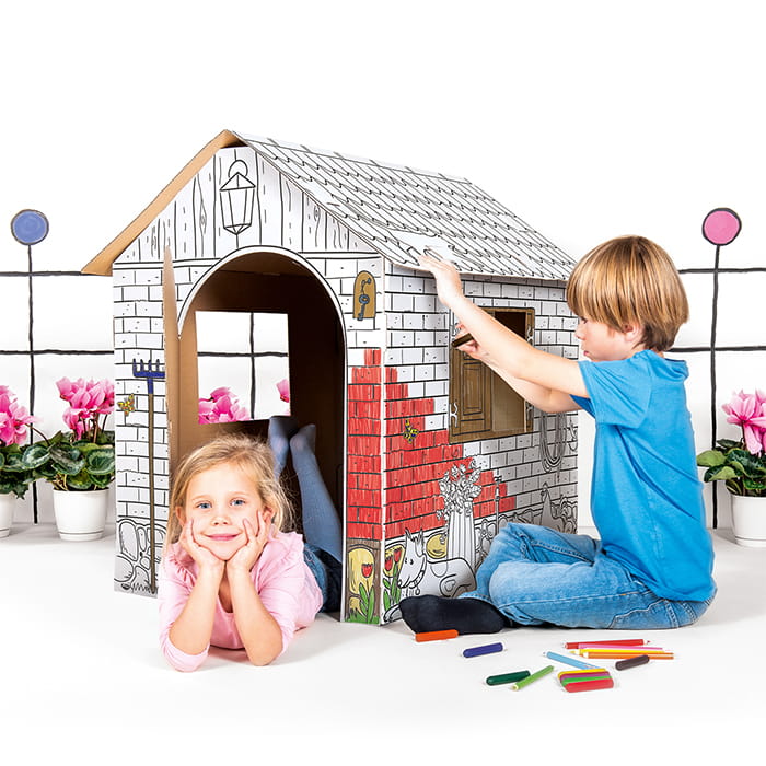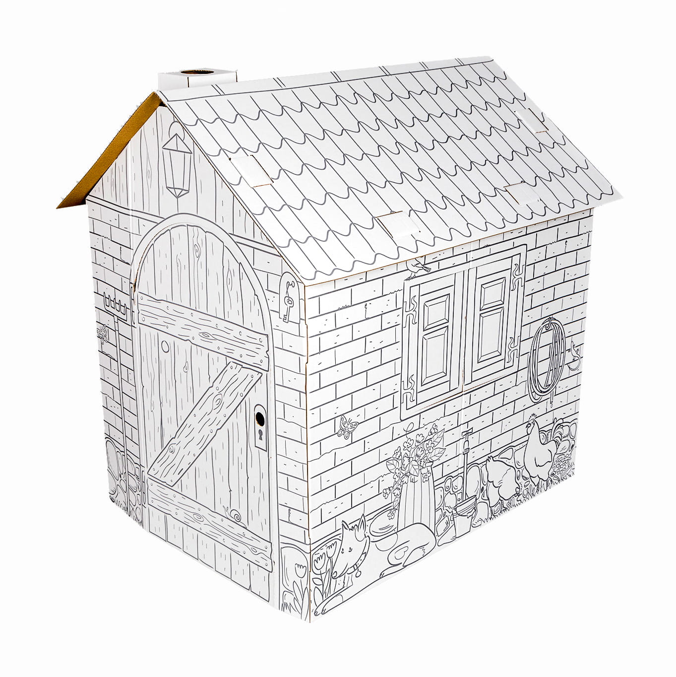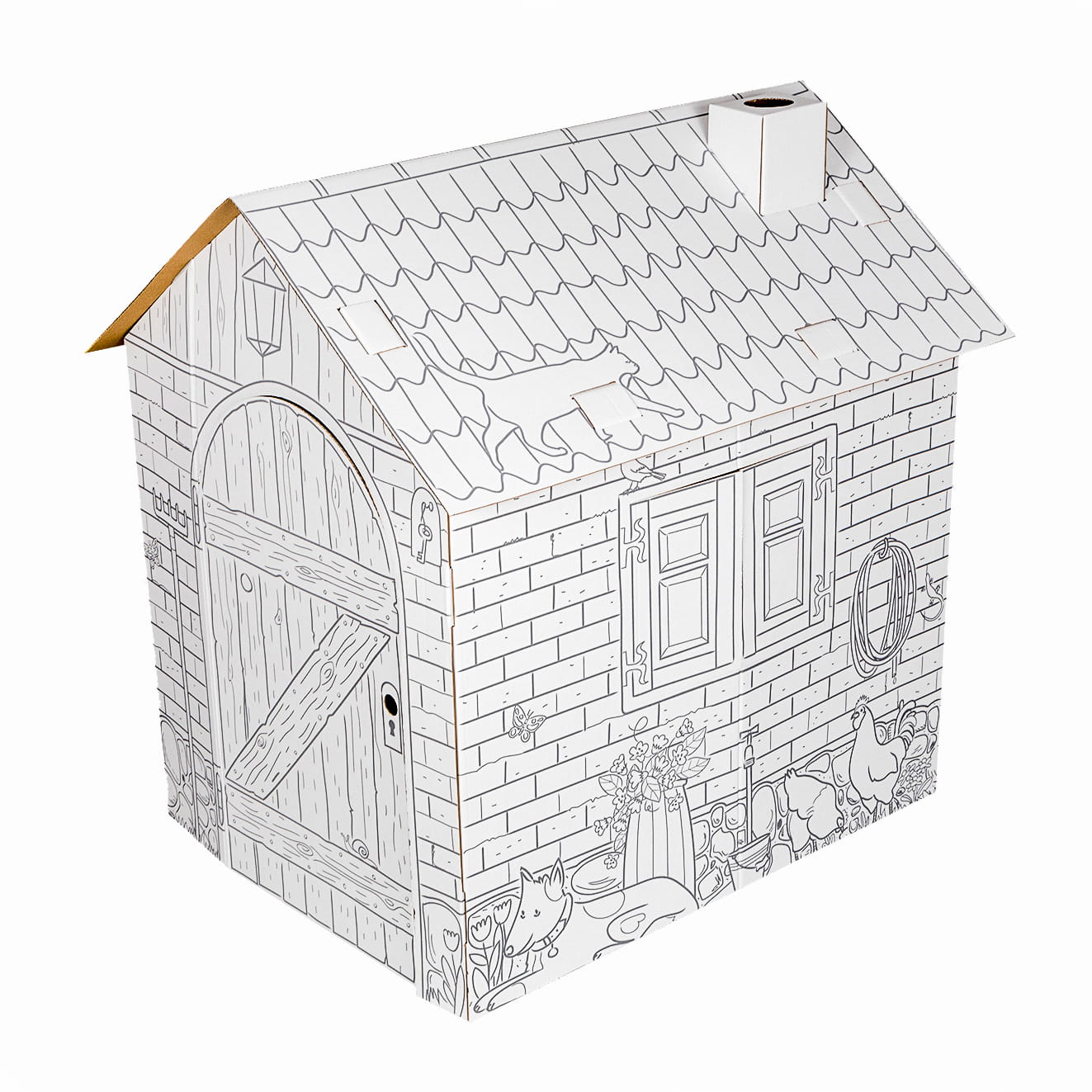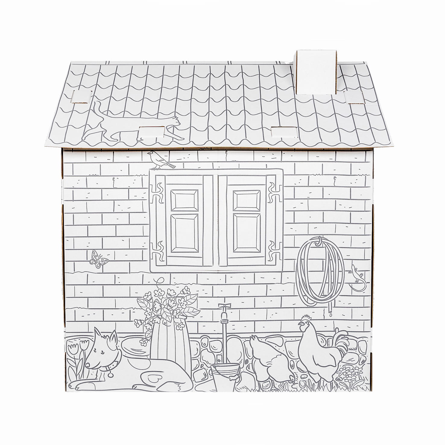 Malownicza Zagroda to domek wykonany z białej tektury falistej, do samodzielnego złożenia i pokolorowania. Zabawka jest odpowiednia dla nawet małych dzieci: nie zawiera małych elementów, a jej wymiary pozwalają na wejście maluchowi do środka.