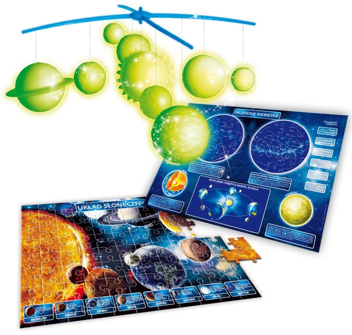 Zestaw umożliwia stworzenie prawdziwego modelu Układu Słonecznego. W opakowaniu znajdują się planety wykonane z fluorescencyjnego plastiku, które świecą w ciemności, co dodaje elementu magicznego i fascynującego do zabawy. Oprócz planet, zestaw zawiera ramię do zawieszenia planet, duży plakat z gwiazdozbiorami, puzzle z Układem Słonecznym oraz instrukcję, co umożliwia kompleksowe zrozumienie struktury i układu planetarnego.