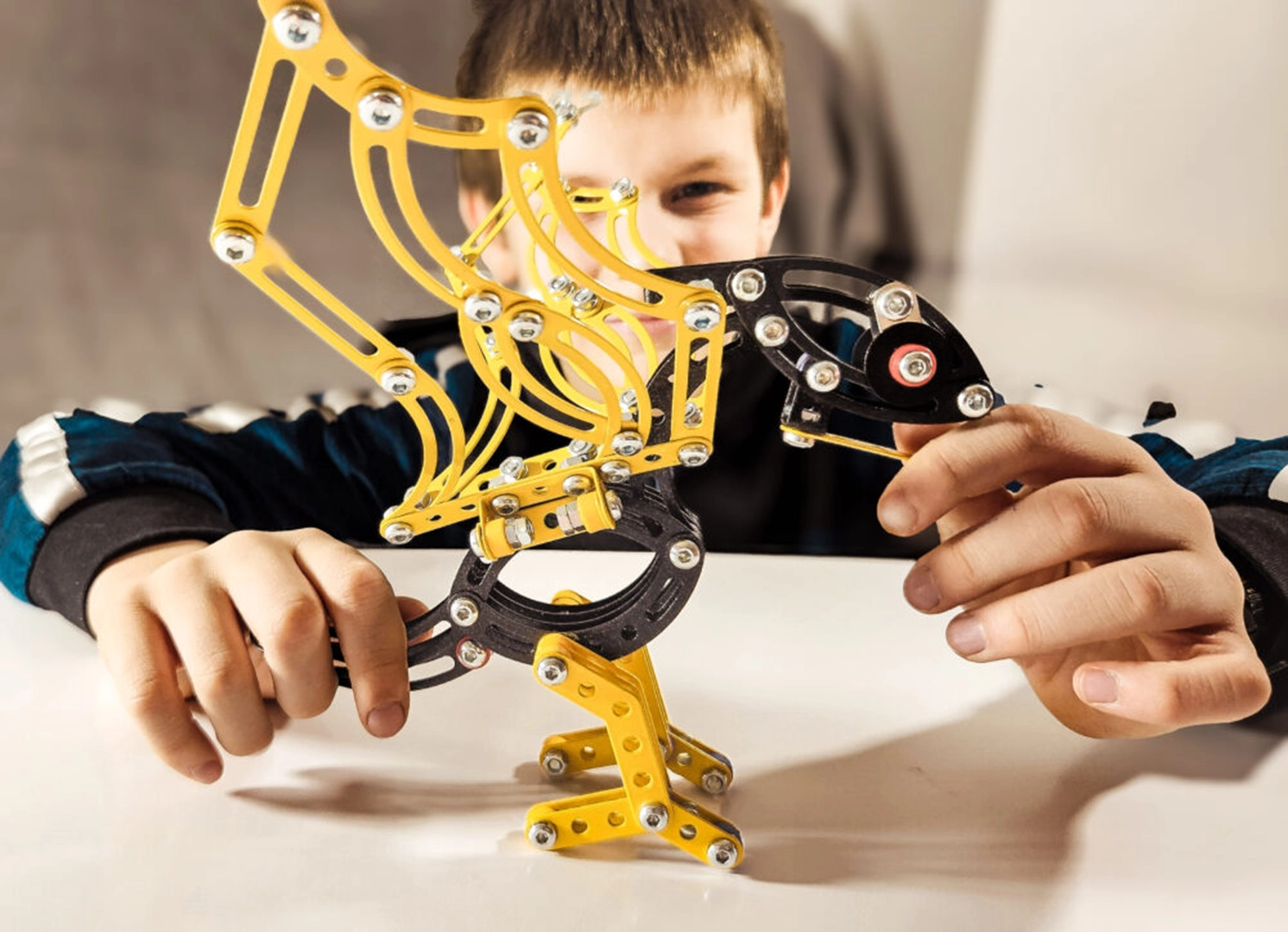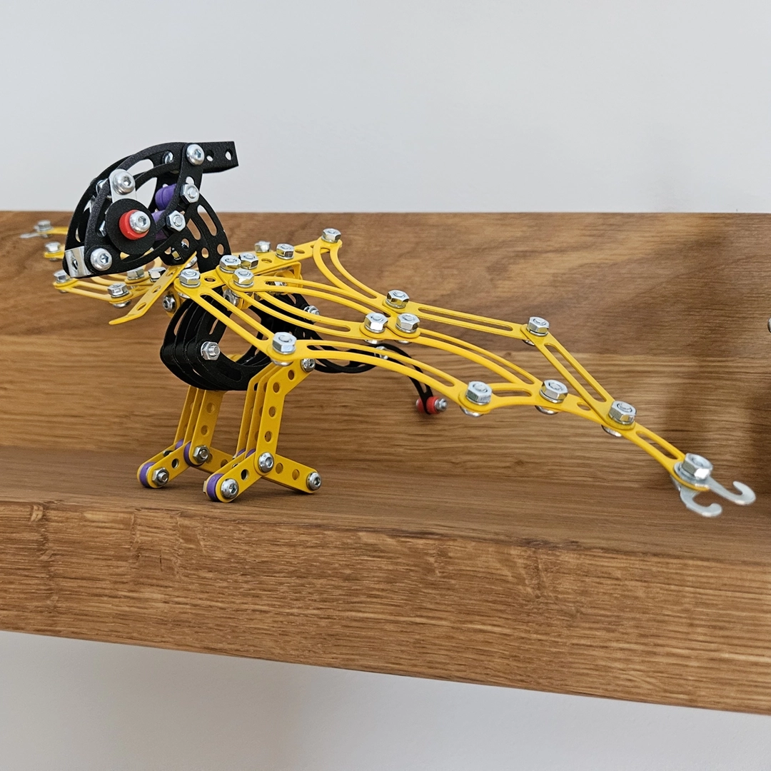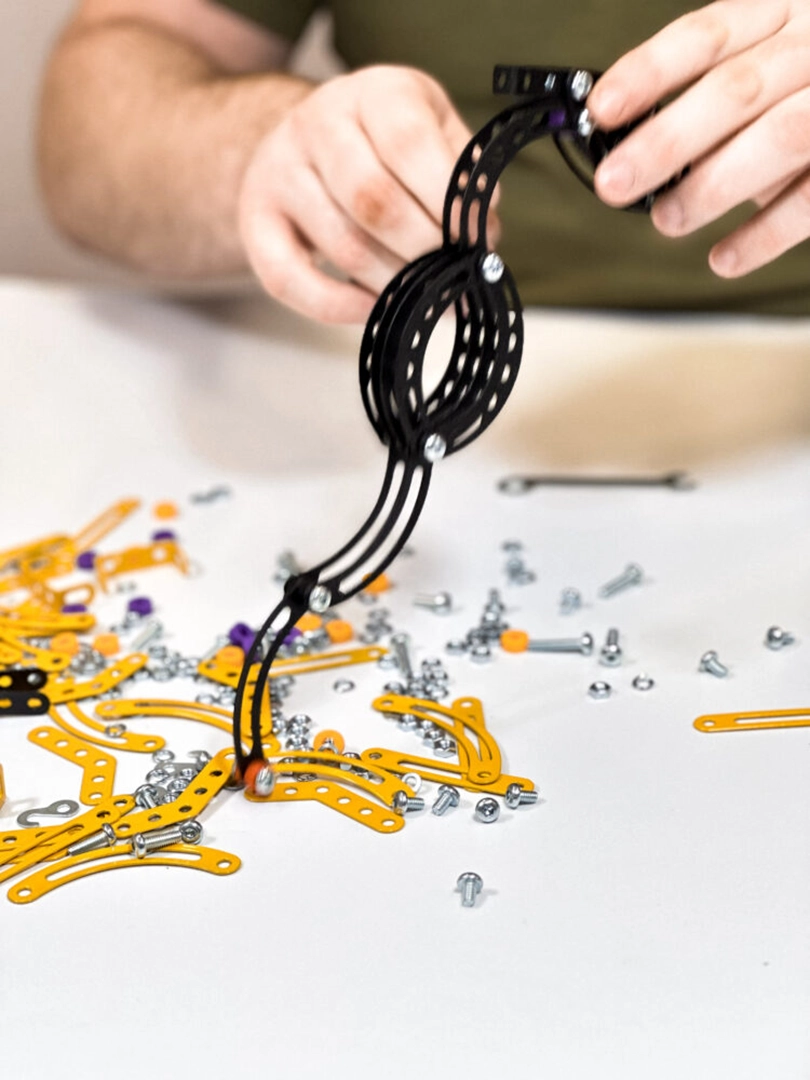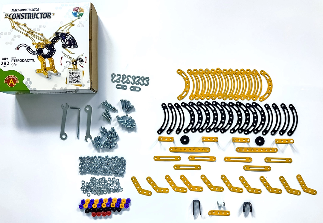 Zestaw zawiera 282 elementy, w tym metalowe blaszki, śrubki oraz kolorowe komponenty, które po złożeniu tworzą ruchomy model pterodaktyla. Dołączone narzędzia montażowe oraz instrukcja krok po kroku ułatwiają proces składania, czyniąc go przystępnym nawet dla młodszych konstruktorów. Po złożeniu, model posiada ruchome skrzydła, głowę i nogi, co umożliwia odgrywanie różnorodnych scenek i pobudza wyobraźnię dziecka.