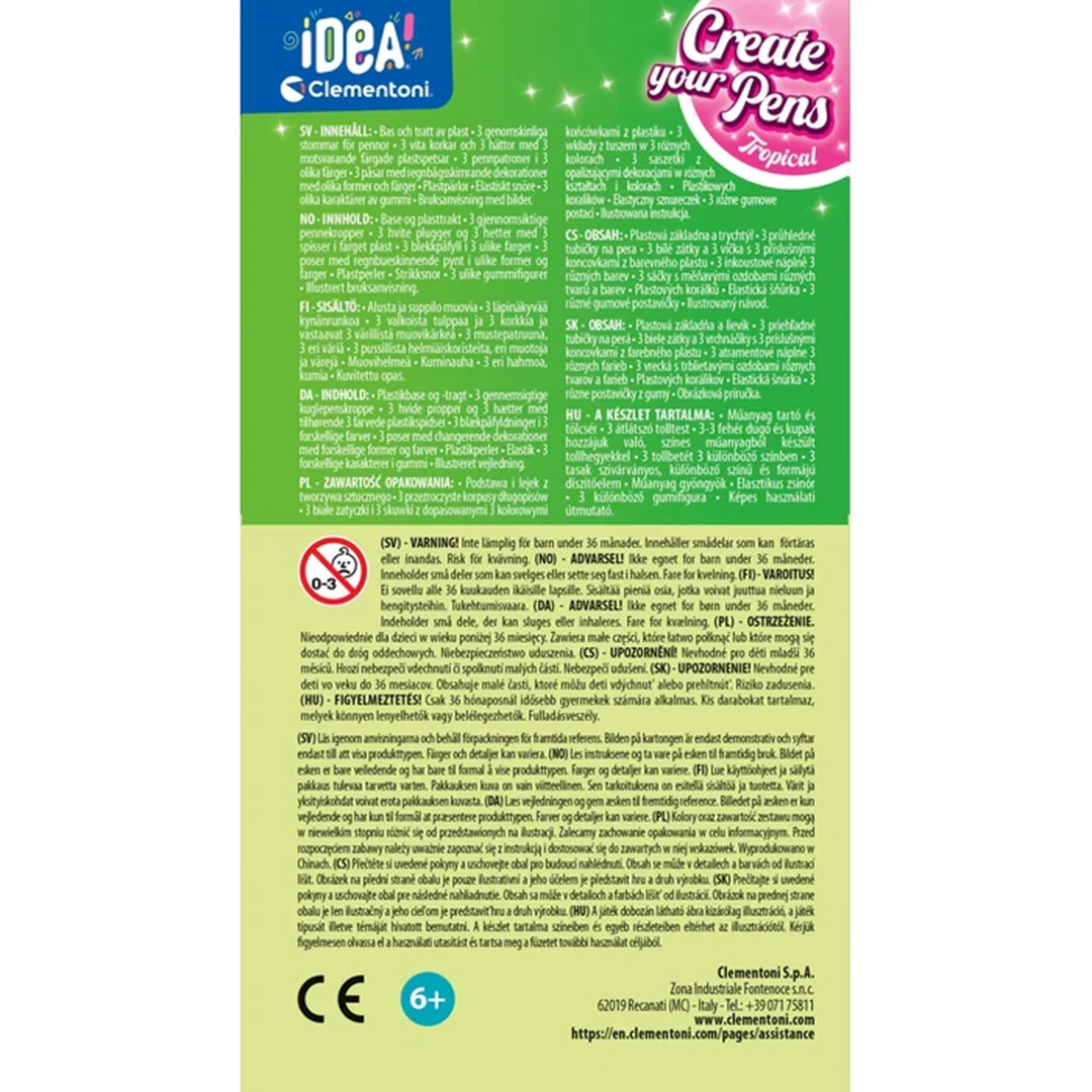 Zestaw kreatywny dla dzieci od 6 lat, który pozwala stworzyć i ozdobić własne długopisy tropikalne. Mini fabryka długopisów Clementoni rozwija wyobraźnię i kreatywność poprzez twórczą zabawę.