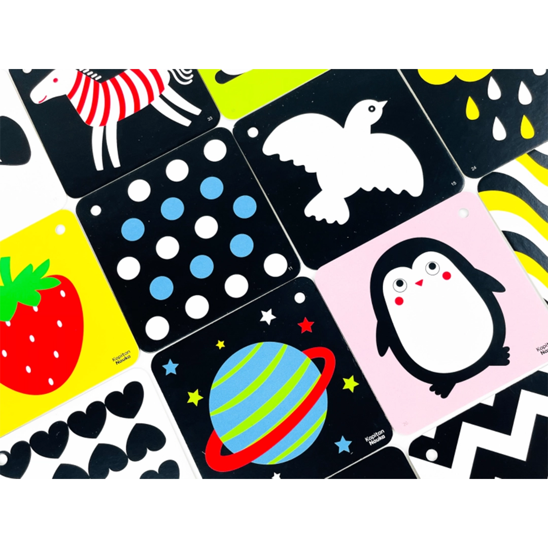 Karty kontrastowe dla niemowląt przedstawiają proste, wyraźne ilustracje w czerni i bieli oraz stopniowo wprowadzają inne kolory. Dzięki temu dziecko może ćwiczyć skupienie wzroku oraz rozwijać zdolność rozpoznawania kształtów.