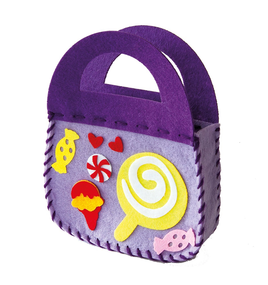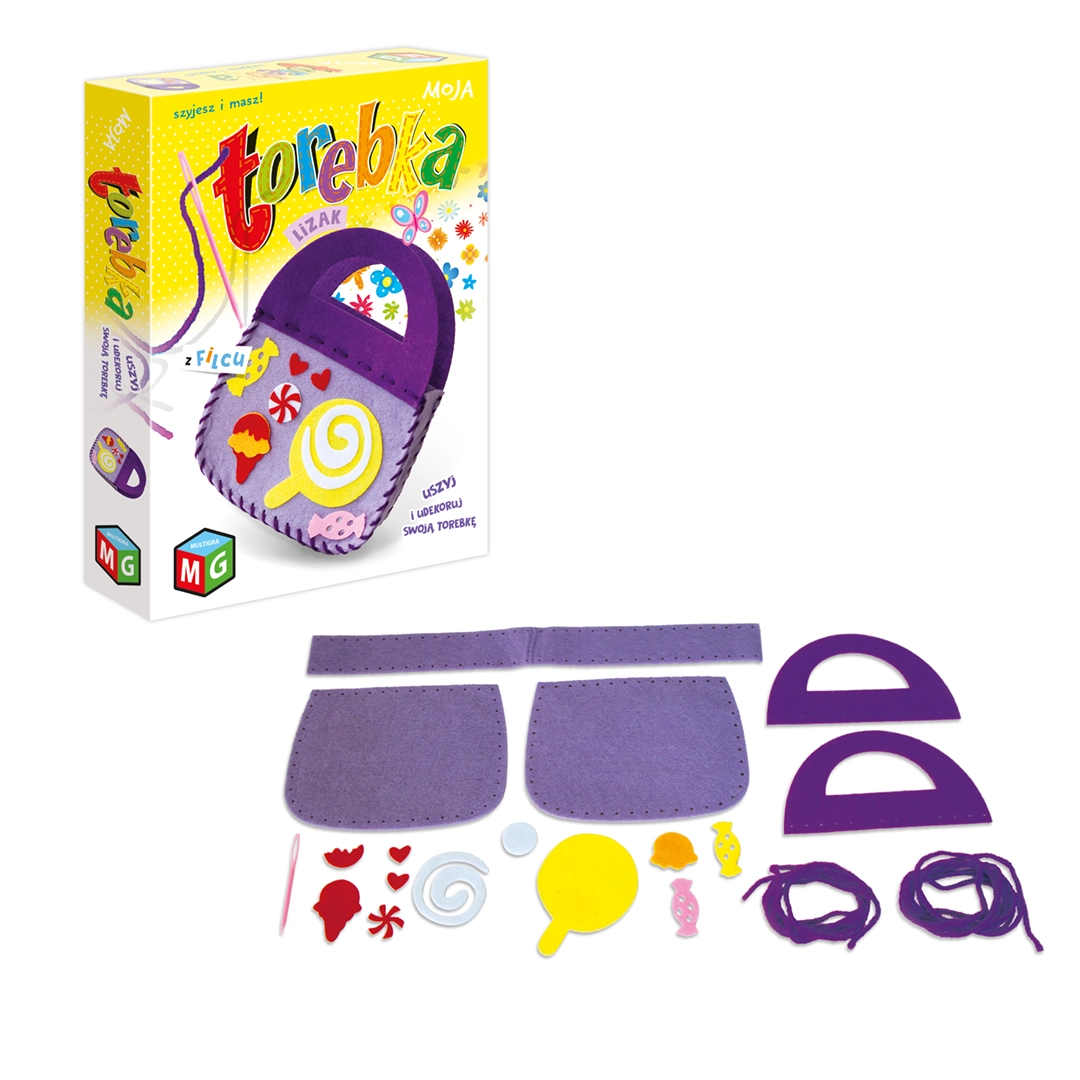 Zestaw kreatywny do szycia i dekorowania torebki w kształcie lizaka. Doskonały dla dzieci 5+, wspierający rozwój manualny i kreatywność.